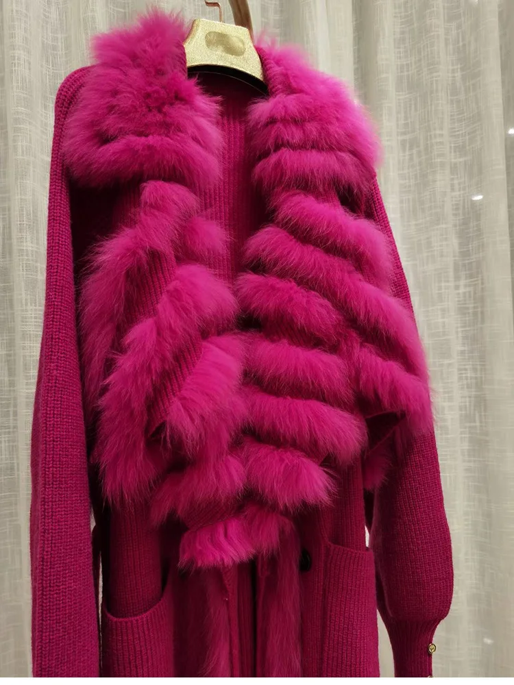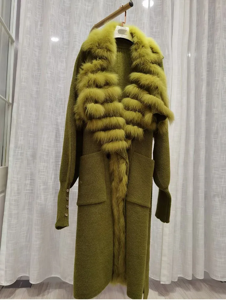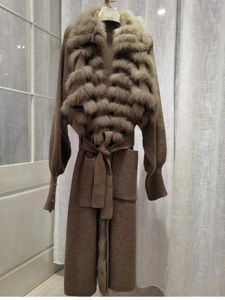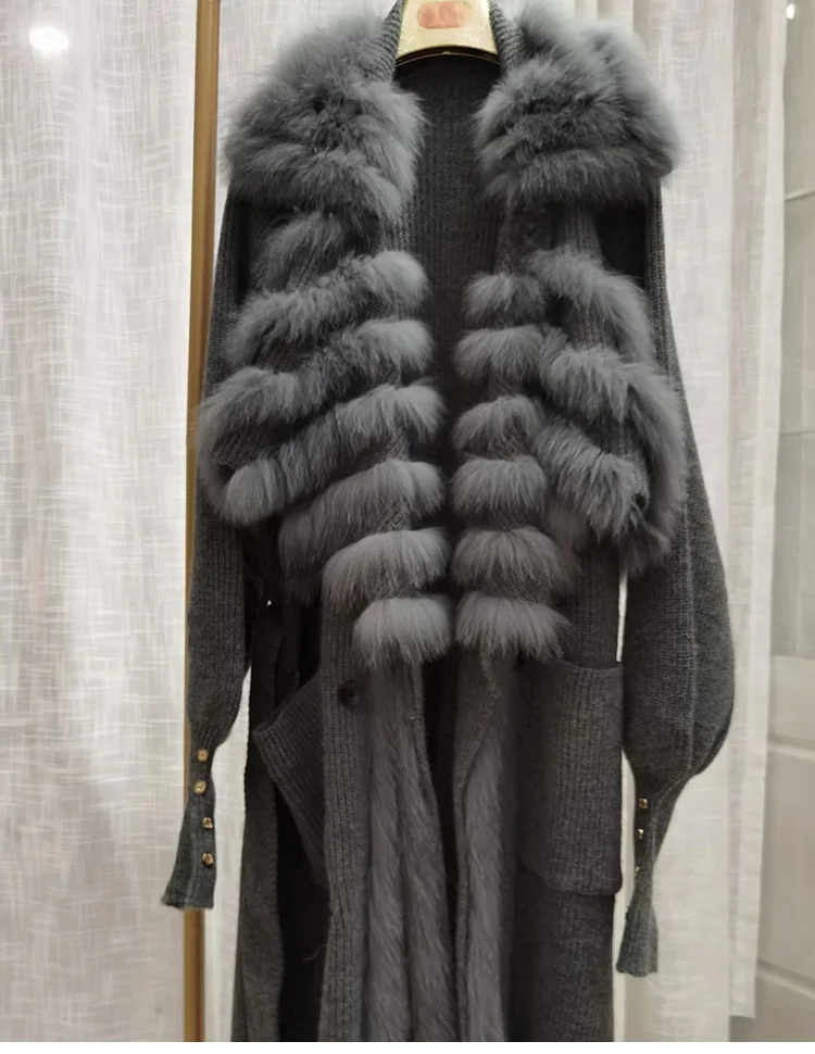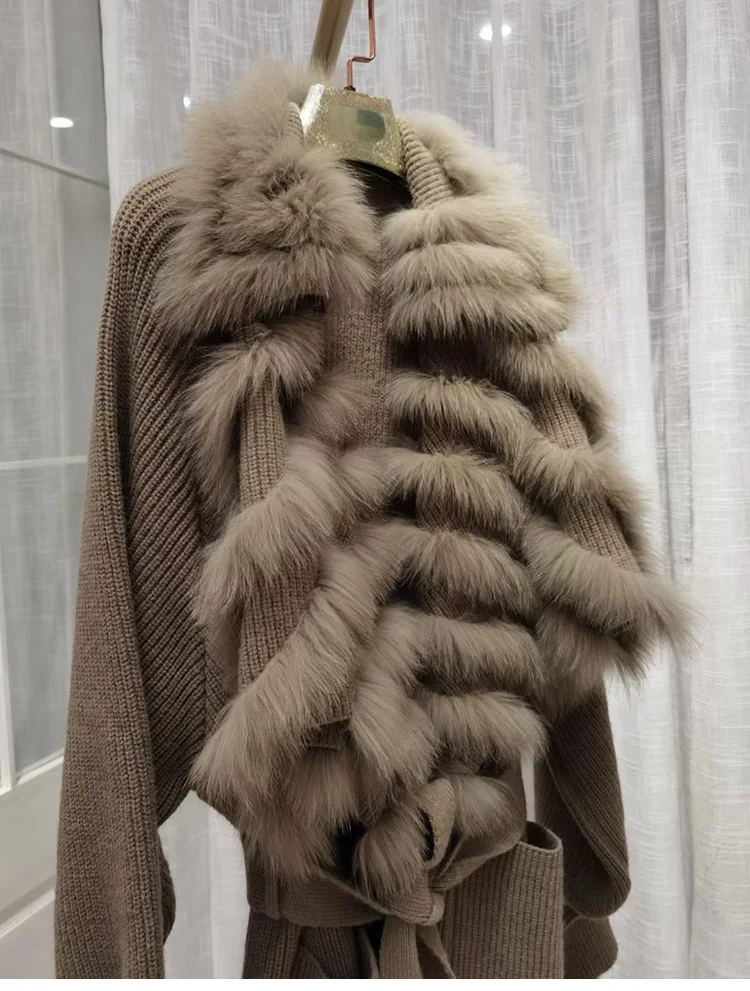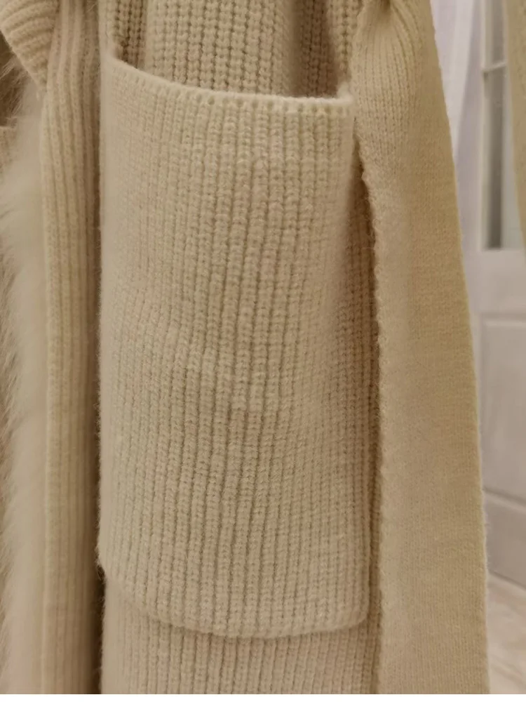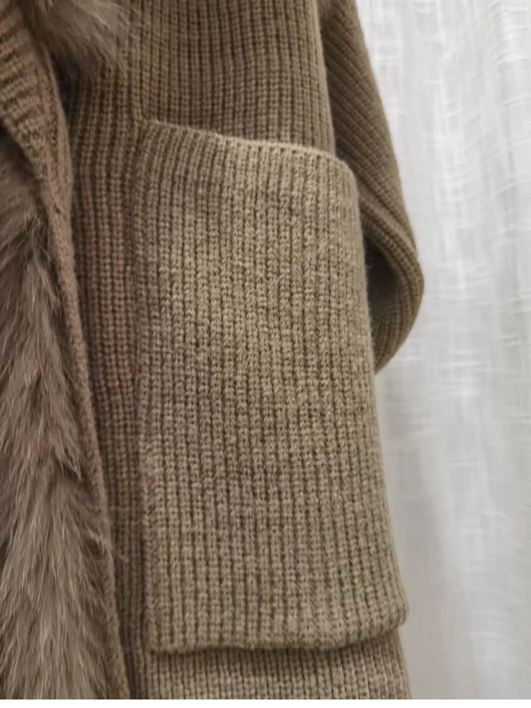 Women's Real Fox Fur Collar Knitted Oversized Maxi Cardigan Sweater Trenchcoat w/ Belt