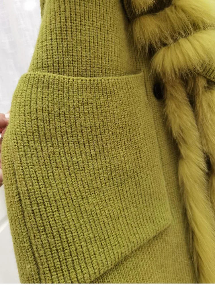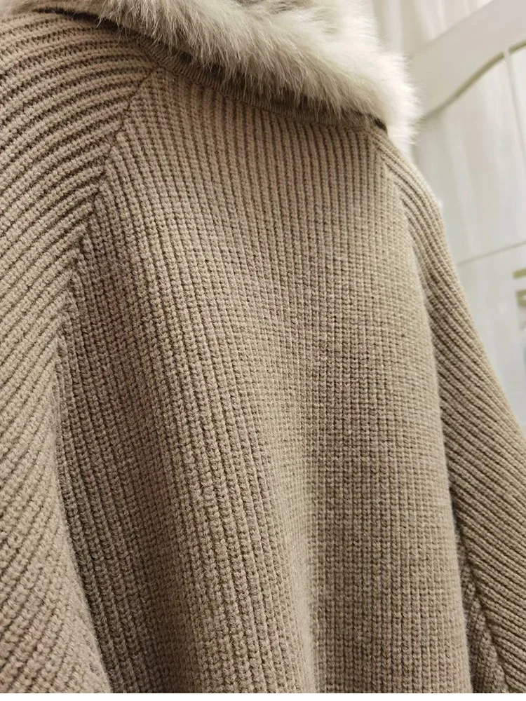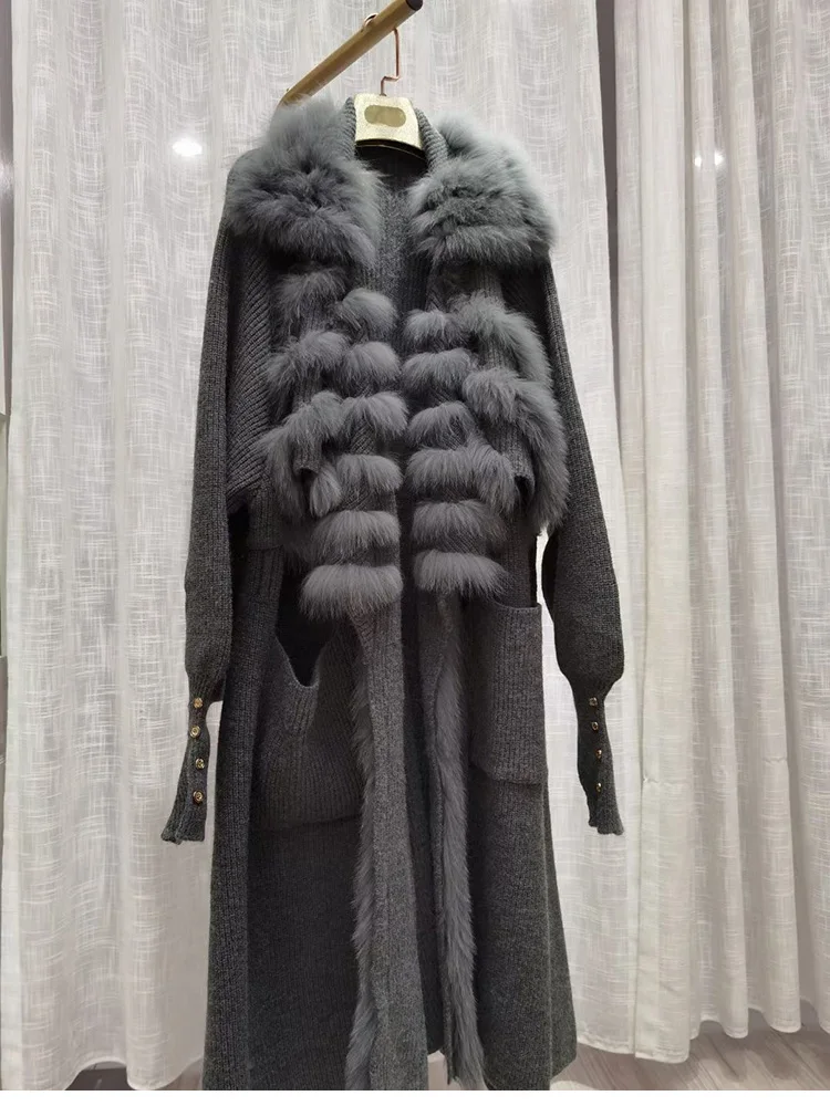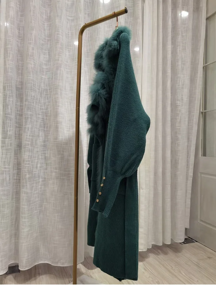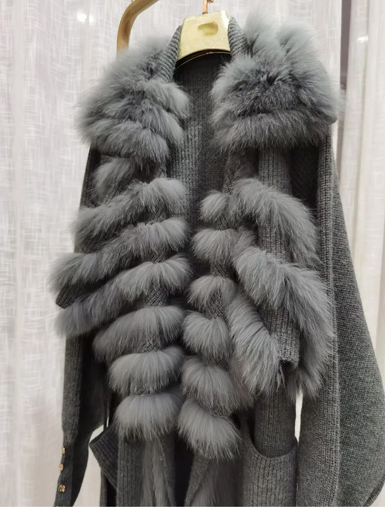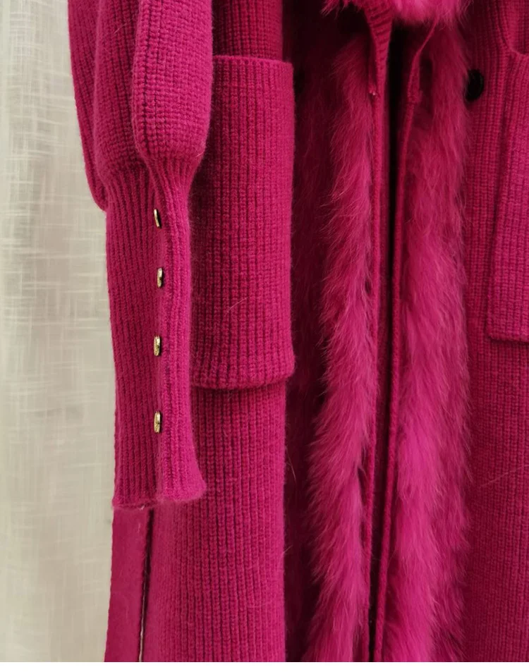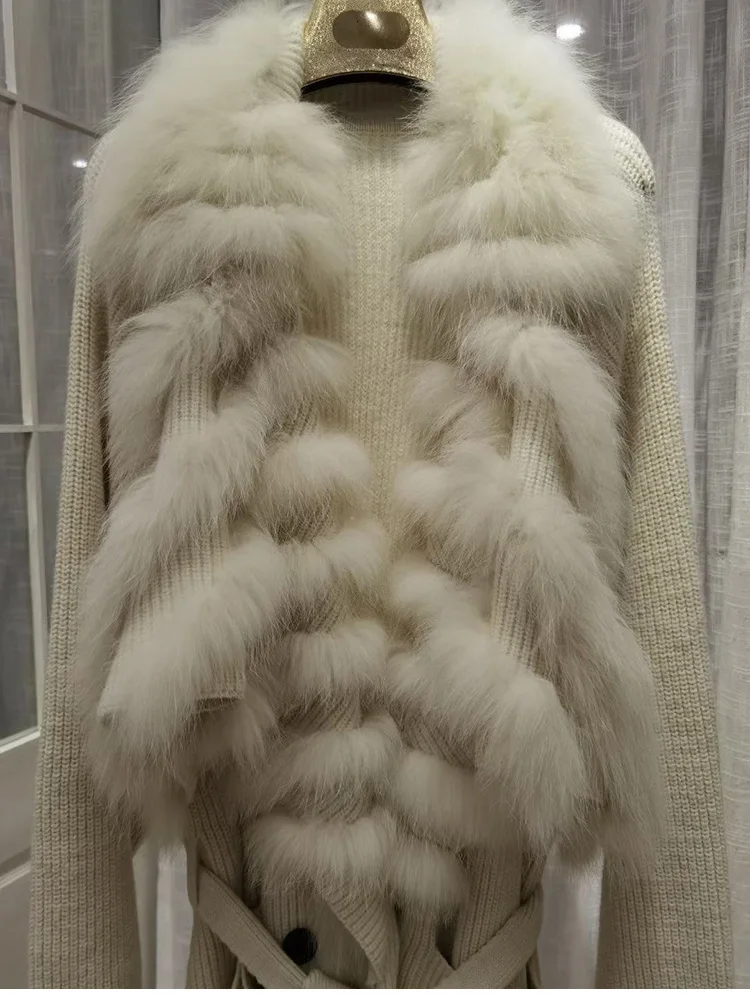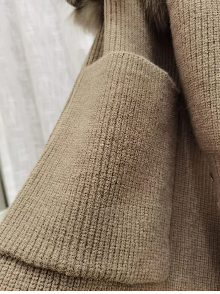 Women's Real Fox Fur Collar Knitted Oversized Maxi Cardigan Sweater Trenchcoat w/ Belt