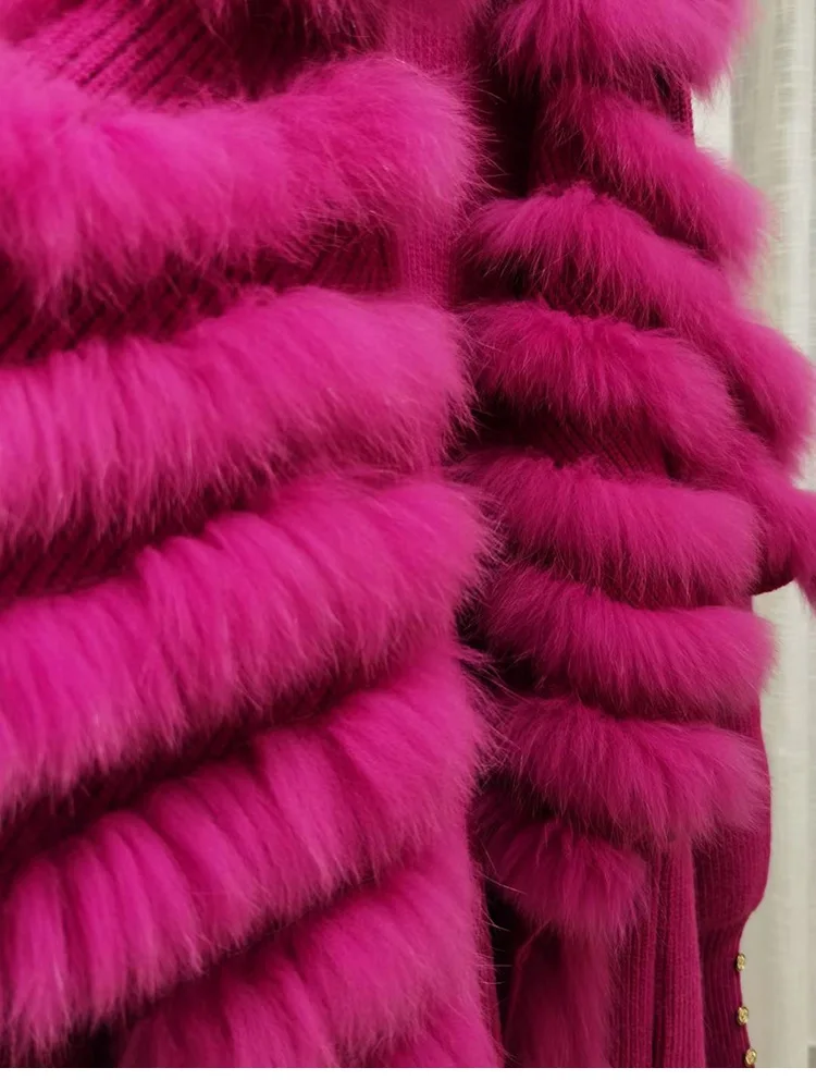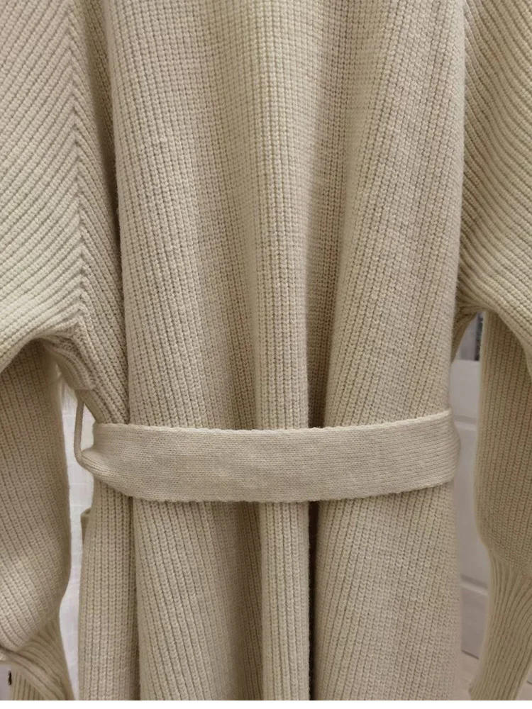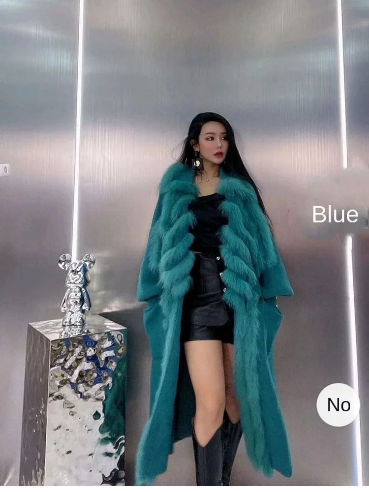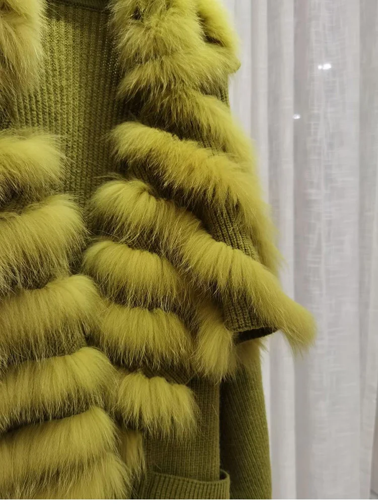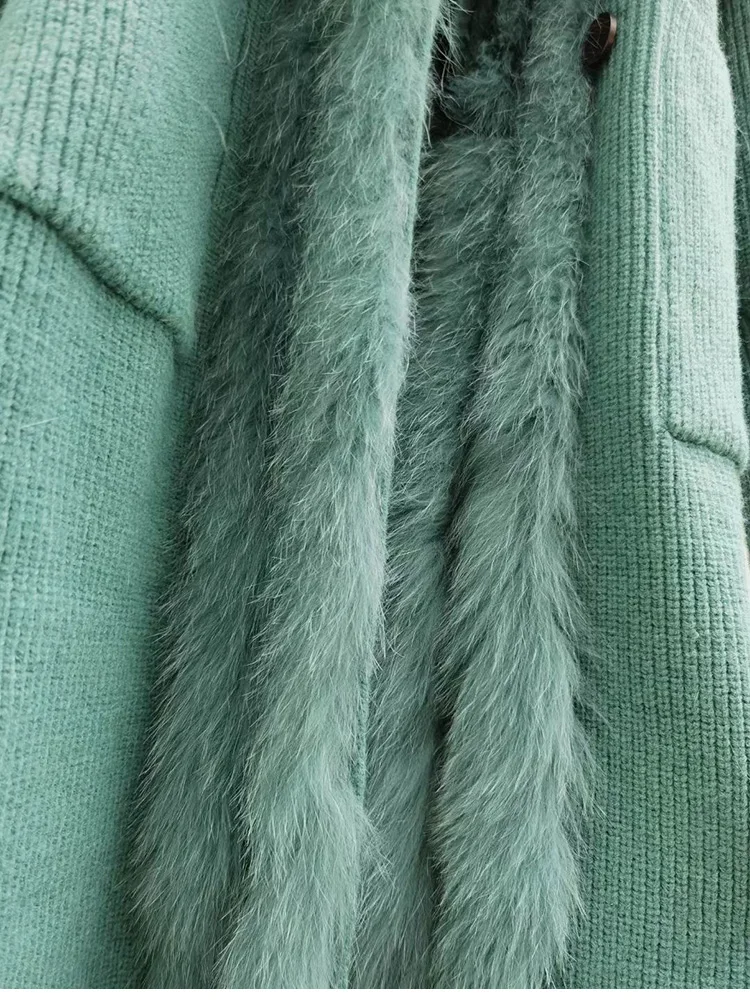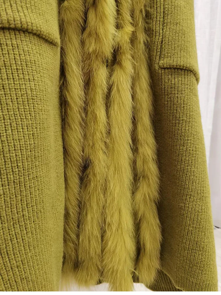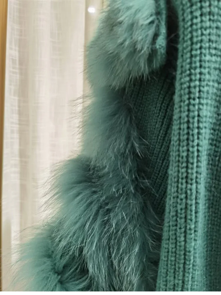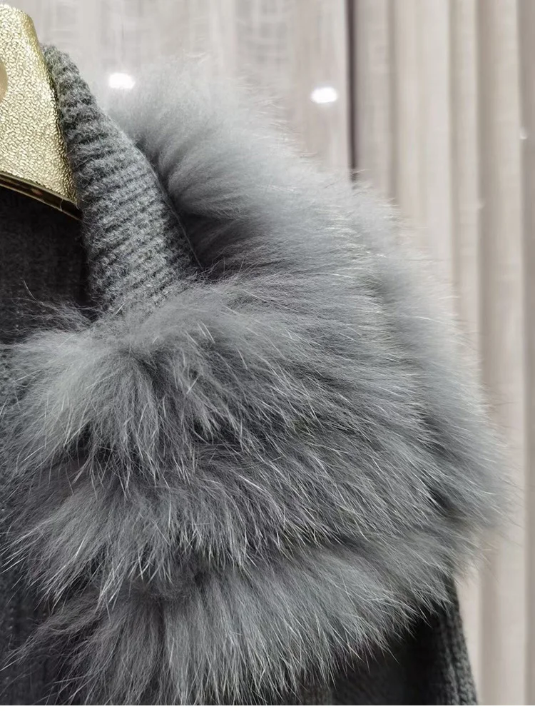 Women's Real Fox Fur Collar Knitted Oversized Maxi Cardigan Sweater Trenchcoat w/ Belt