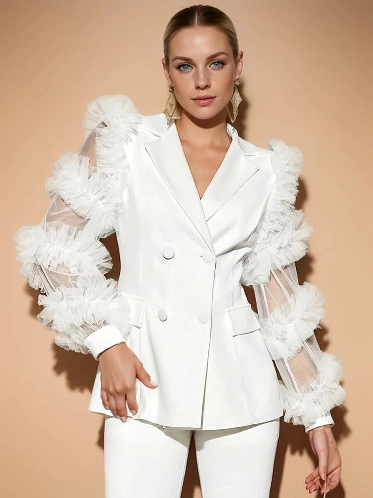 White Faux Fur Patchwork Sheer Mesh Sleeve Notched Collar Long Sleeve Double Breasted Women's Formal Blazer Jacket