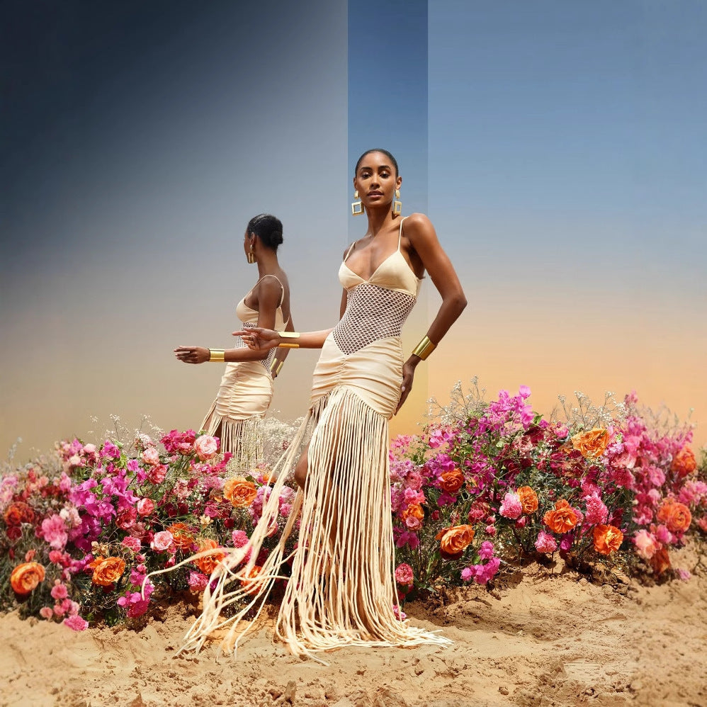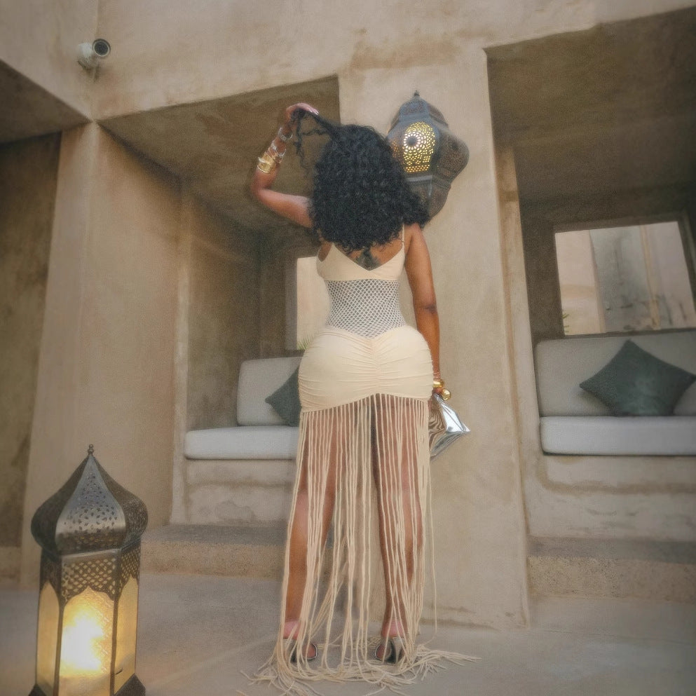 Champagne Mesh Net Hanging Tassel Fringe Design Sleeveless V-Neck Spaghetti Strap Formal Party Dress