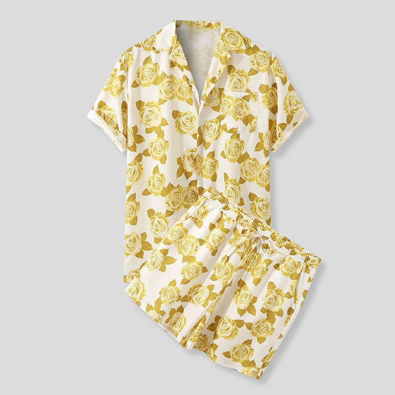 Men's Turn-Down Collar Short Sleeve Button-Up Hawaiian Shirt + Shorts 2-Piece Set