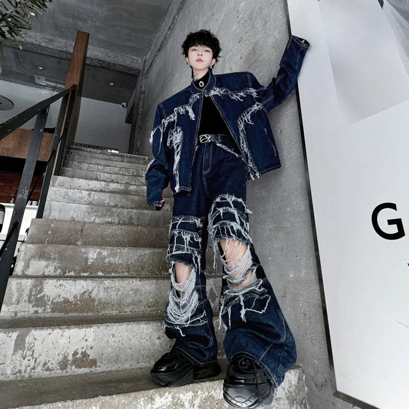 Men's Burgundy/Blue Denim Tassel Fringe Burr Design Jean Jacket + Ripped Hollow-Out Baggy Jeans 2-Piece Sets
