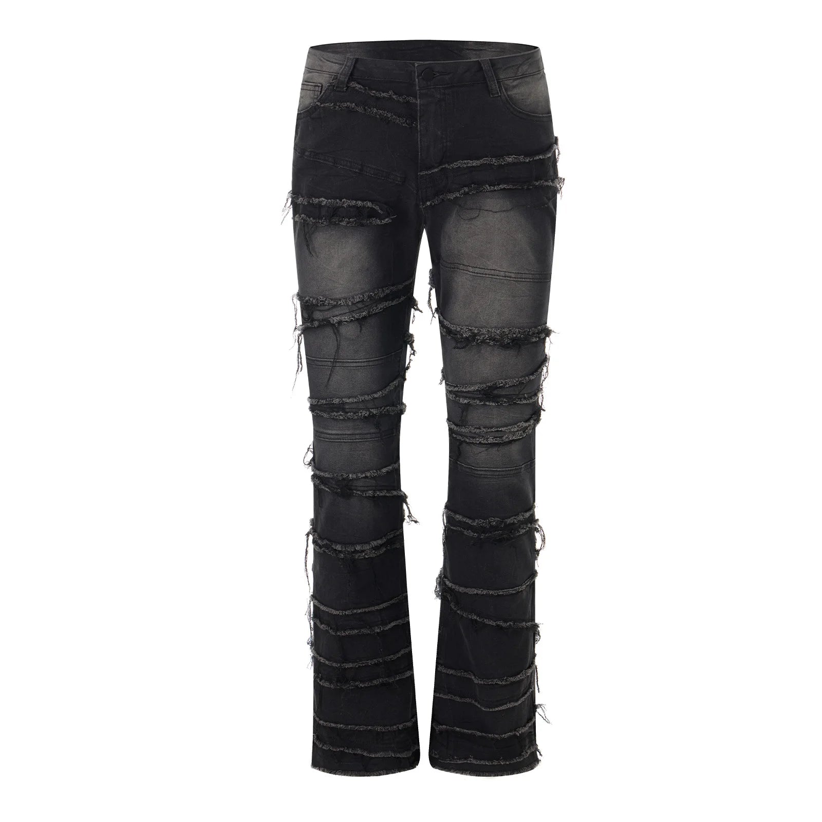 Men's Denim Black Monkey Washed Tiered Tassel Fringe Design Pull-On Raw Trim Pockets Straight Leg Jeans