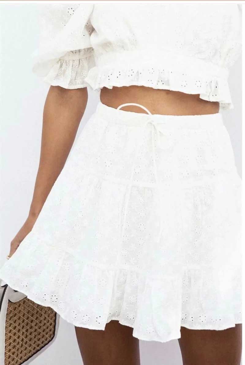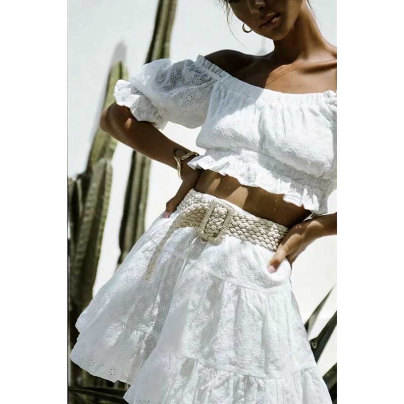 White Lace Ruffled Short Puff Sleeve Off-the-Shoulder Crop Top + Shorts Women's 2-Piece Set