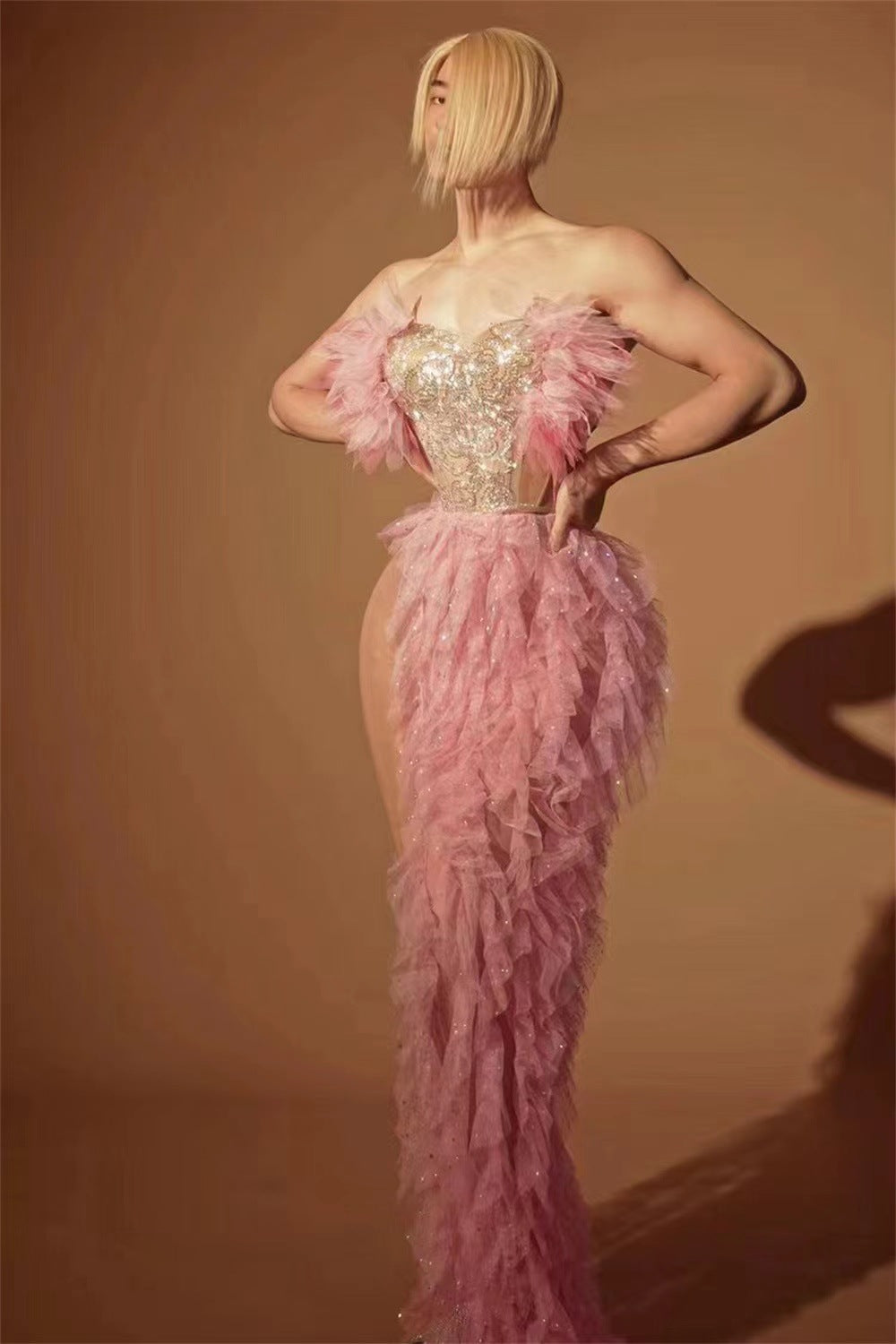 Sleeveless Corset Rhinestone Tassel Fringe Chain Design Ruched High Slit Tube Top Formal Club Dress