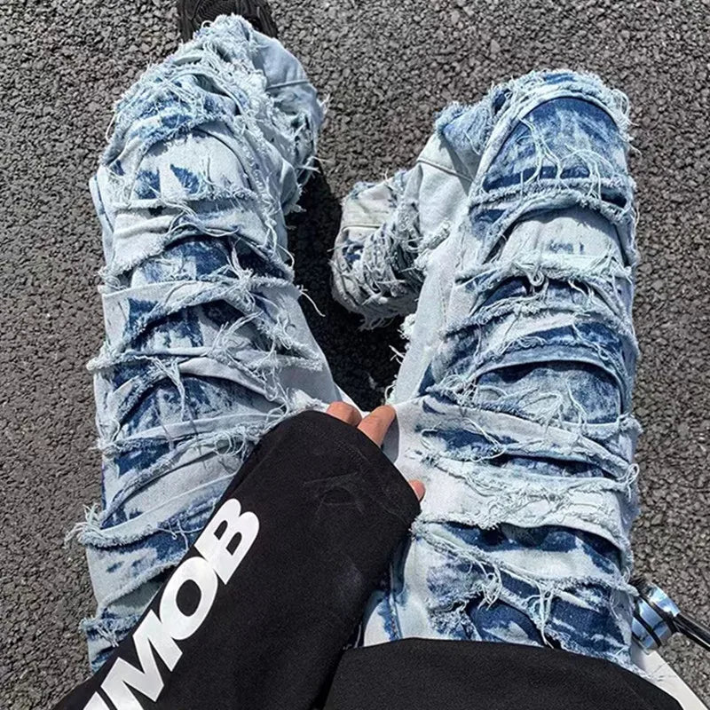 Men's Denim Ripped Fringe Grunge Y2K Streetwear Stacked Hip-Hop Skinny Jeans