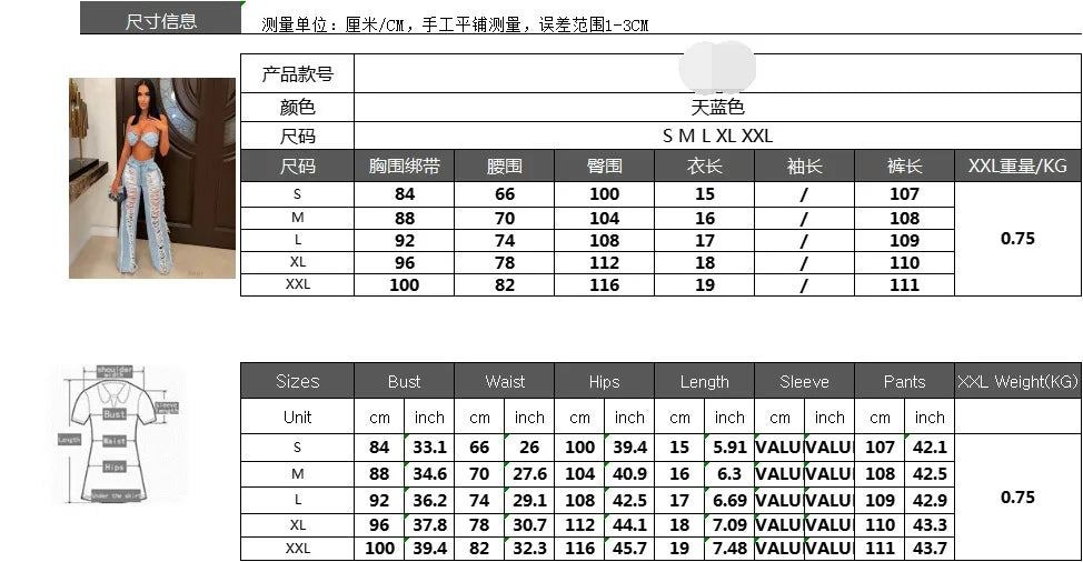 Sky Blue Denim Sleeveless Crop Tube Top + Ripped Women's Tassel Fringe Hollow-Out Two Piece Sets Women Outifits