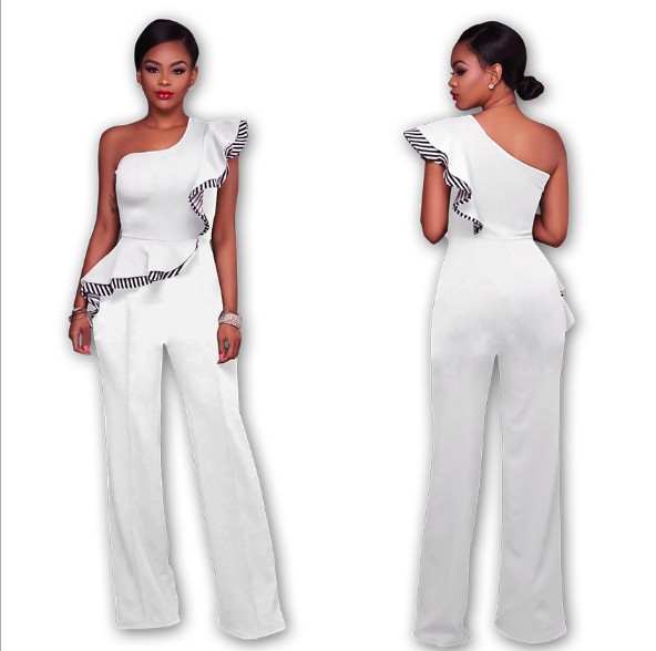Asymmetrical Ruffled Stripe Detail Women's One Shoulder Jumpsuit