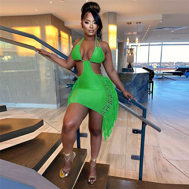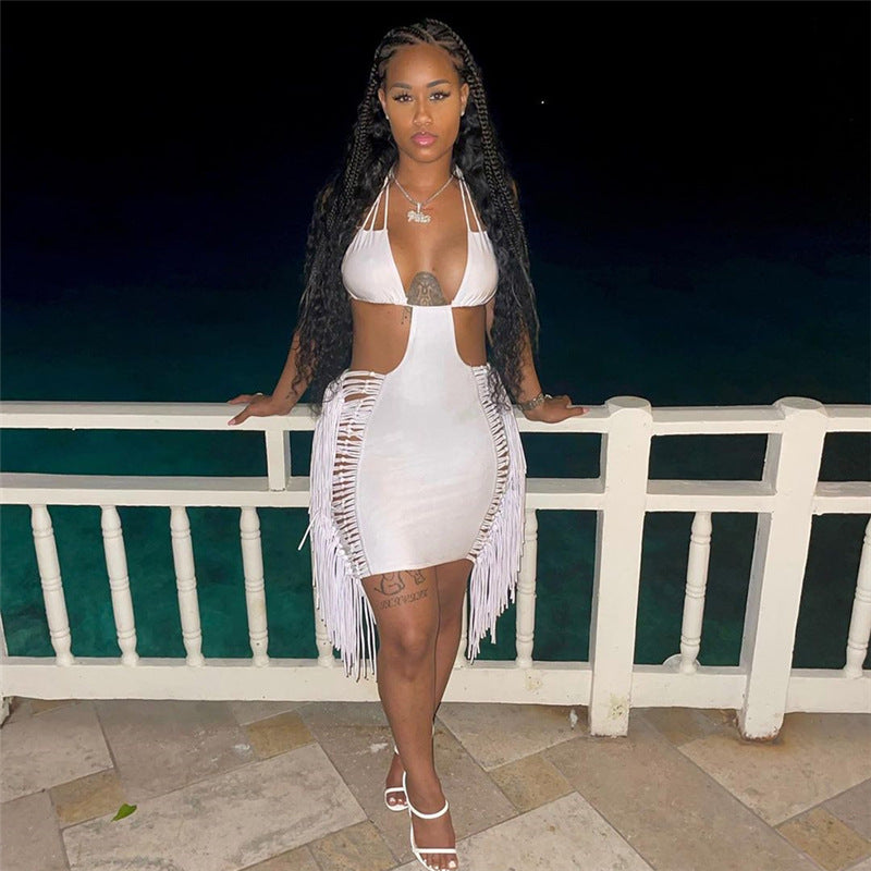 Sleeveless Tassel Fringe Design Halter Backless Hollow-Out Skinny Mini Dress