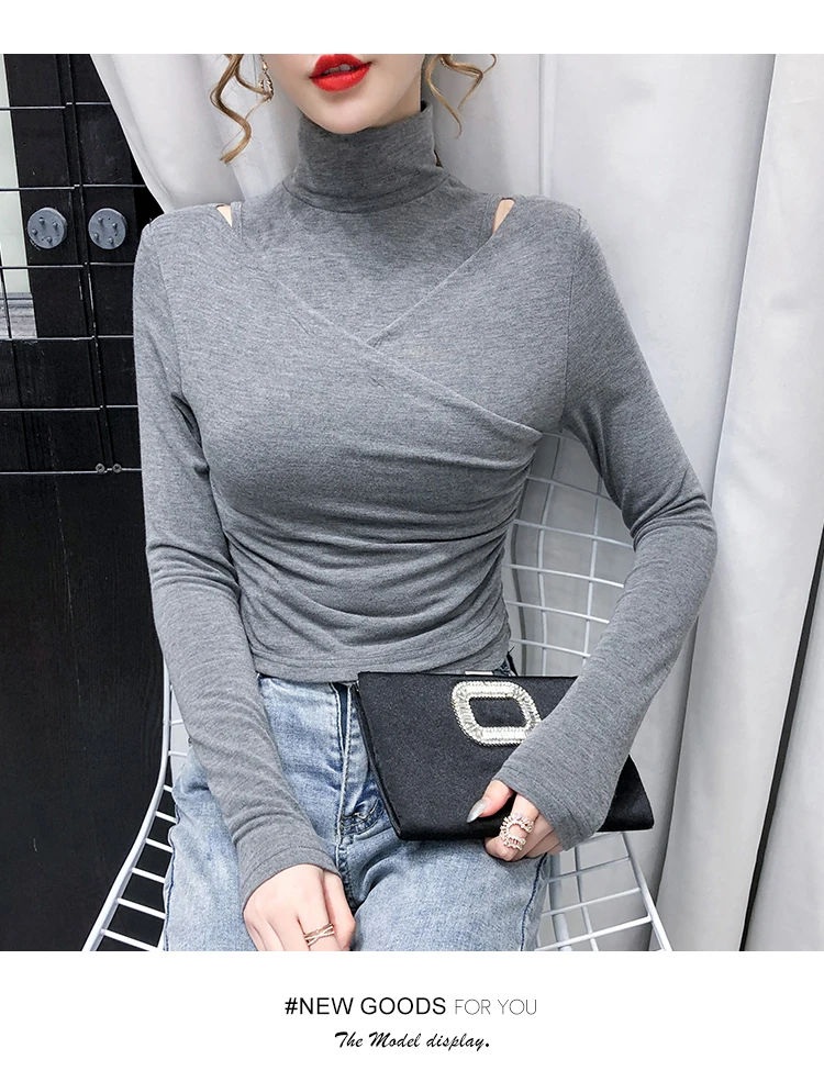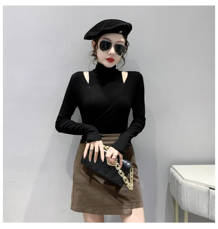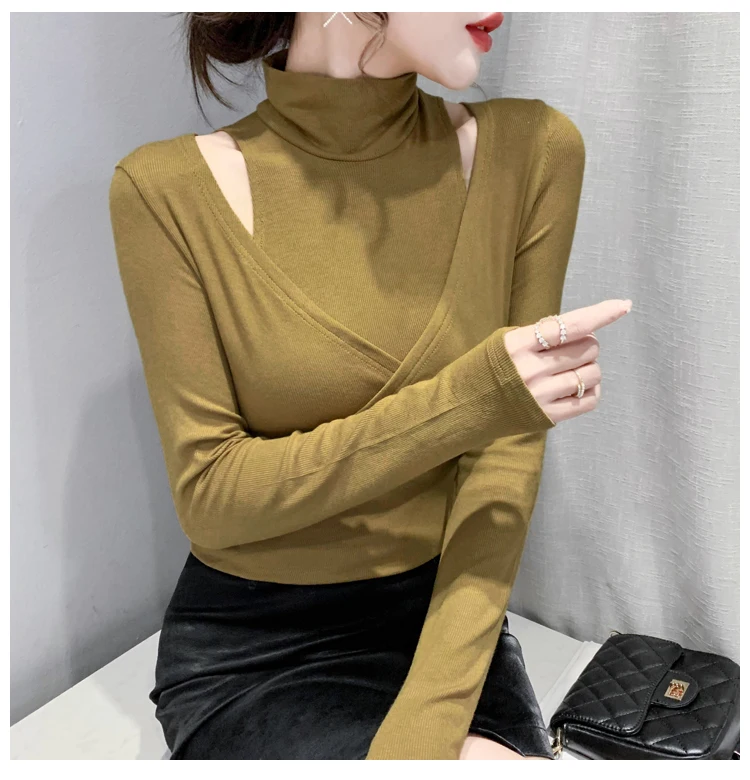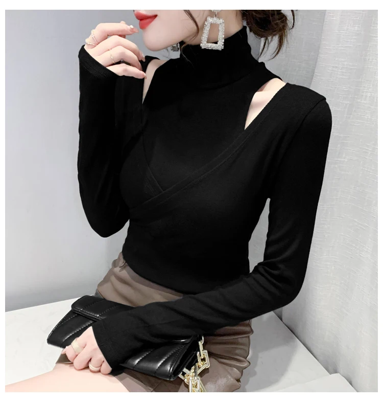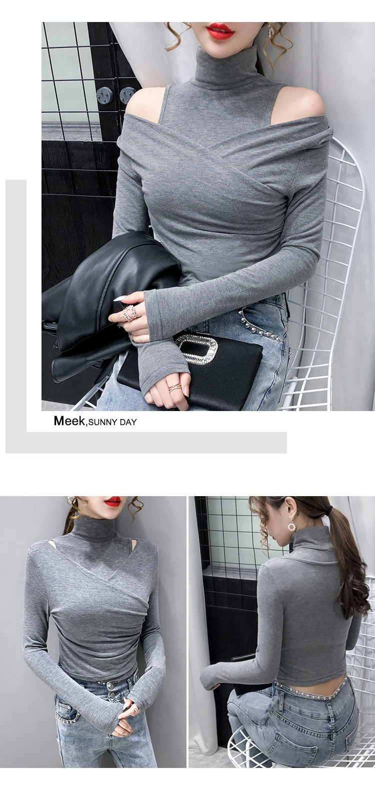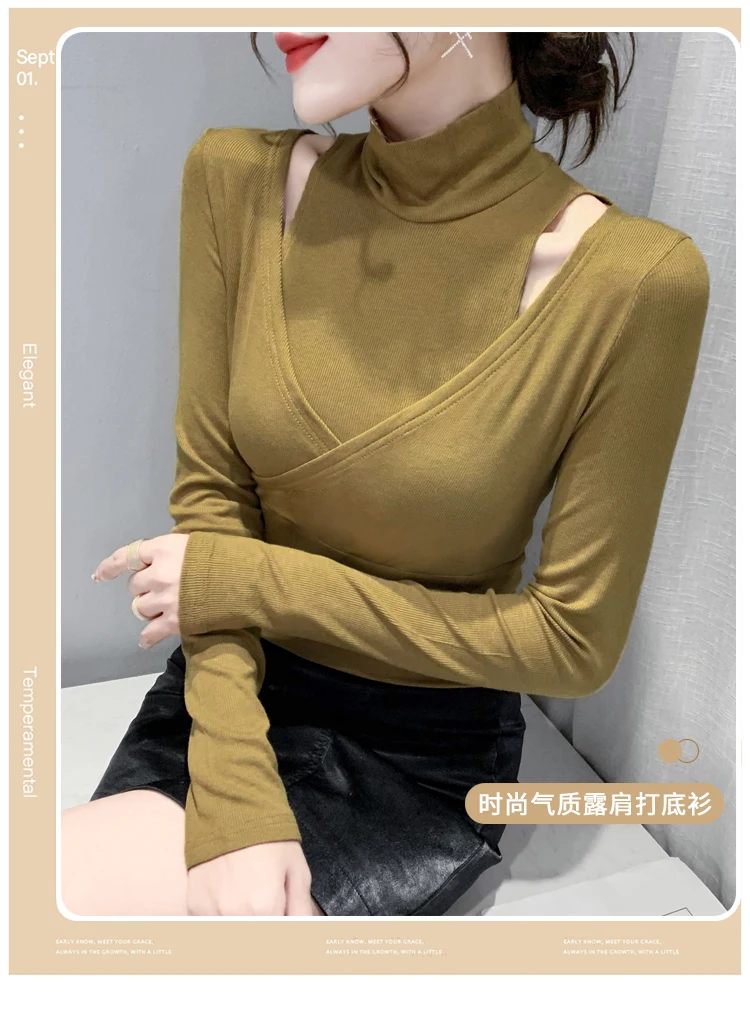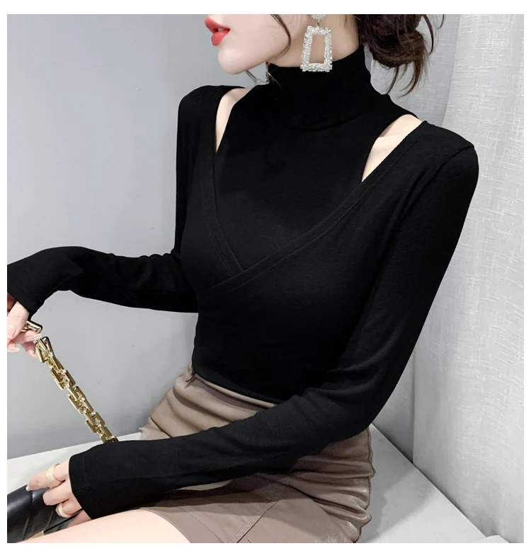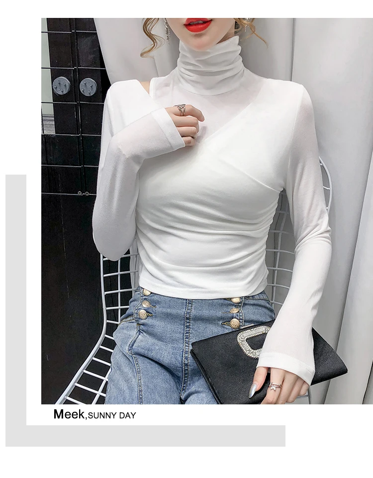 Off-The-Shoulder Holiday Turtle Neck Top Female Clothing 2021 Fall Tops Design Feeling God Femme Long Sleeve White Crops T-Shirt