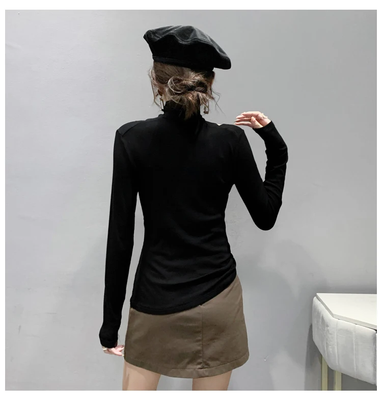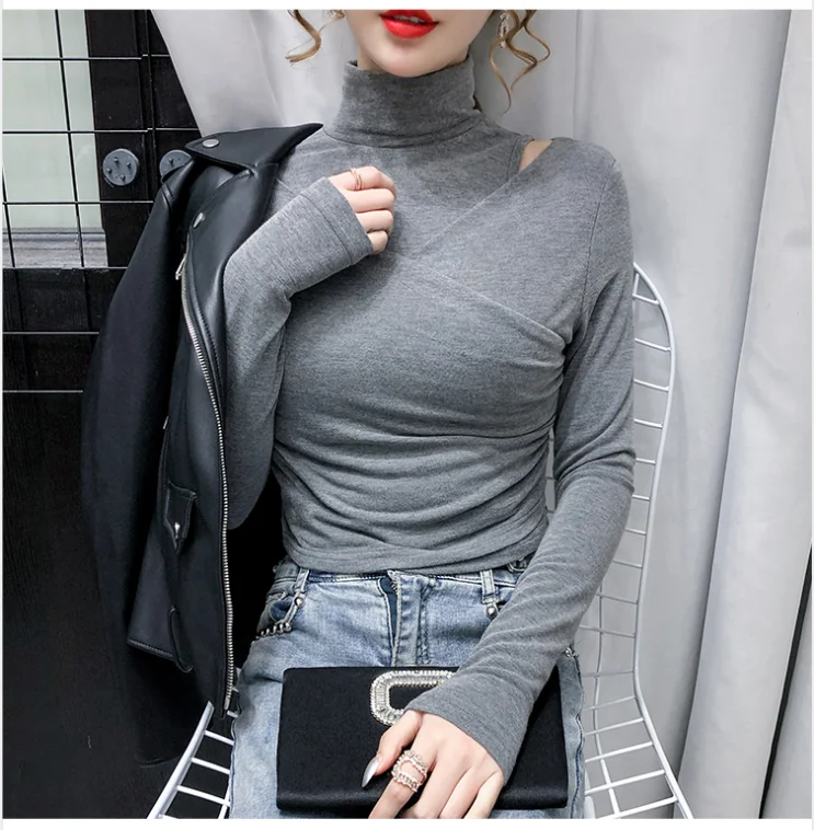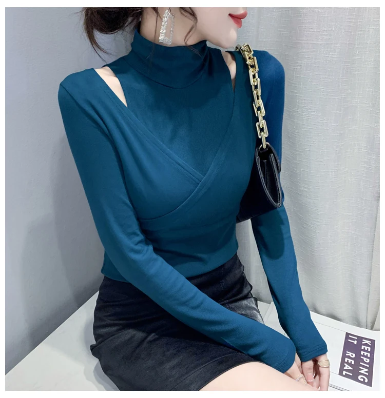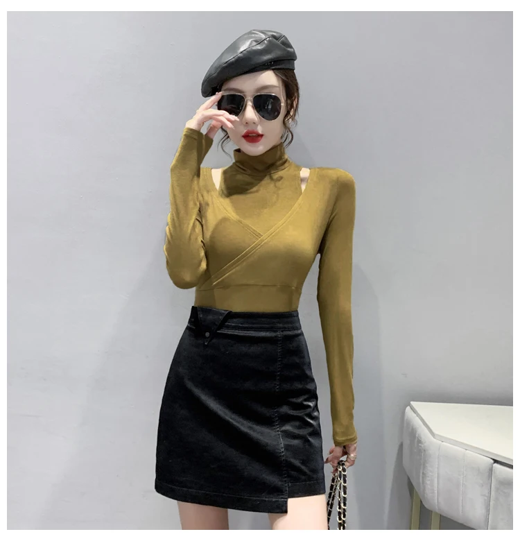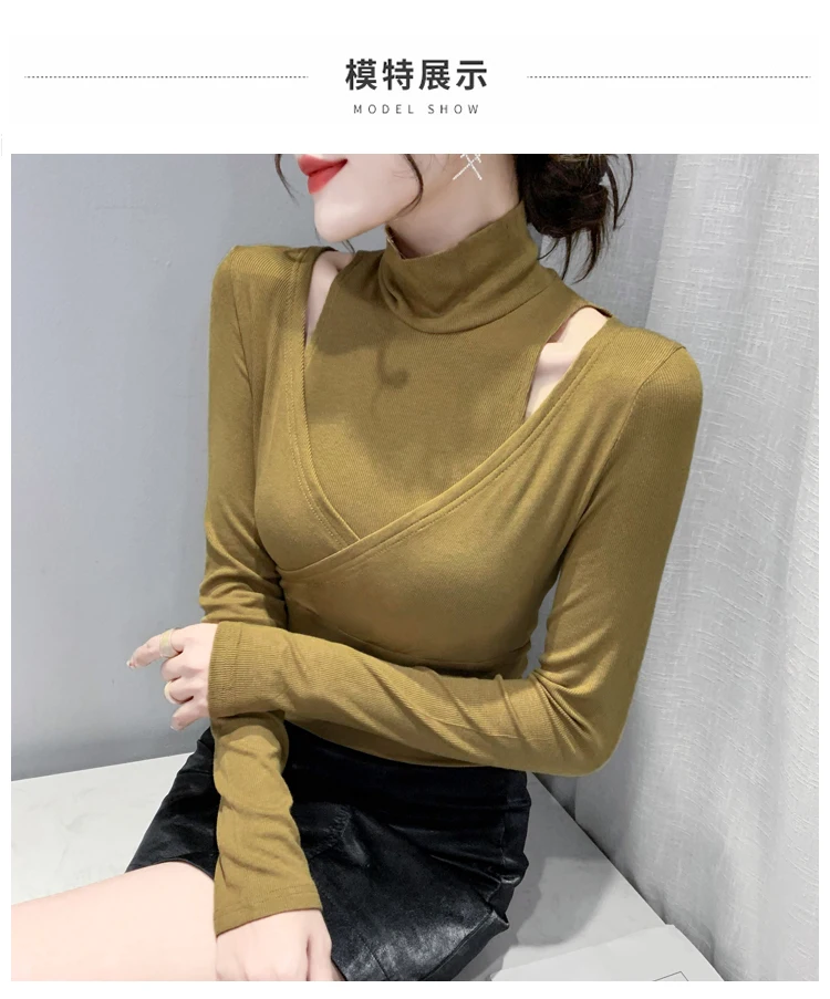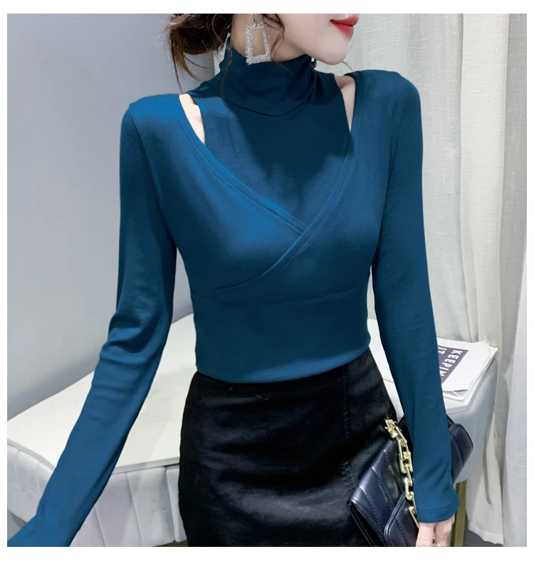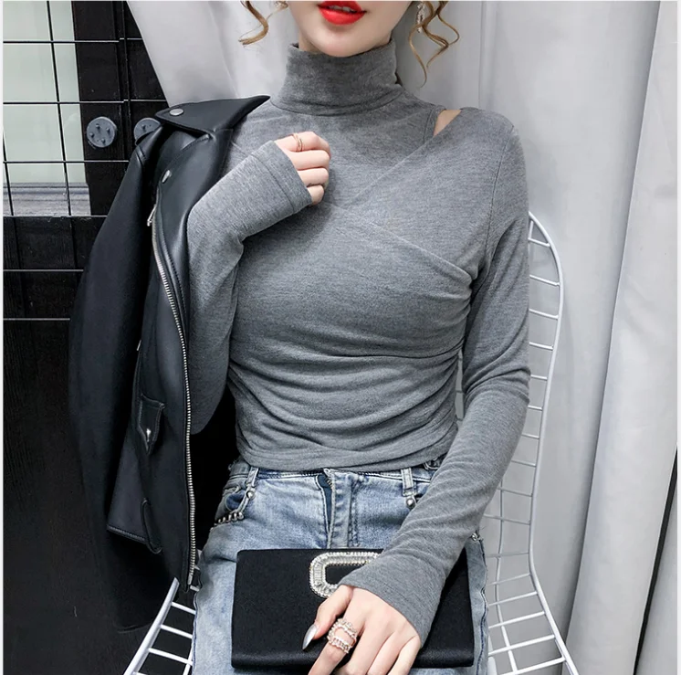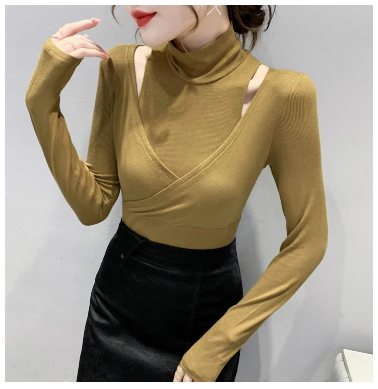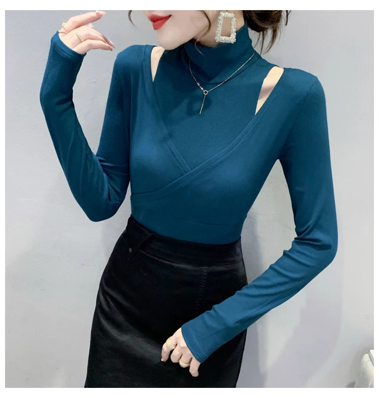 Off-The-Shoulder Holiday Turtle Neck Top Female Clothing 2021 Fall Tops Design Feeling God Femme Long Sleeve White Crops T-Shirt