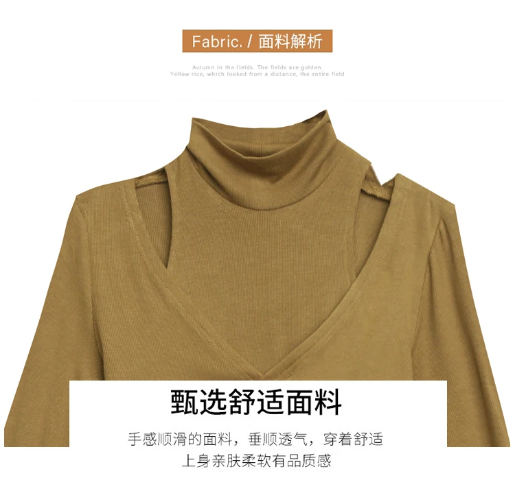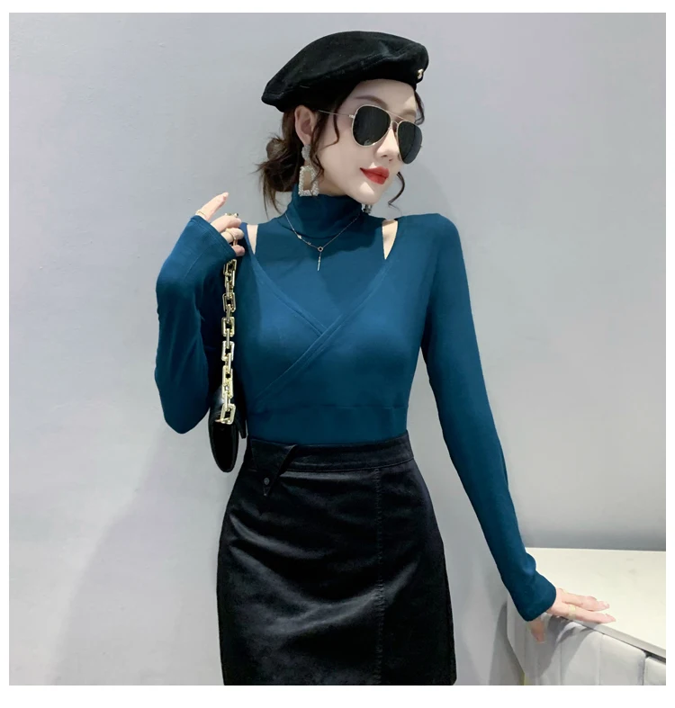 Patchwork Women's Hollow-Out Turtleneck Long Sleeve Off-The-Shoulder Bodycon Skinny Shirt