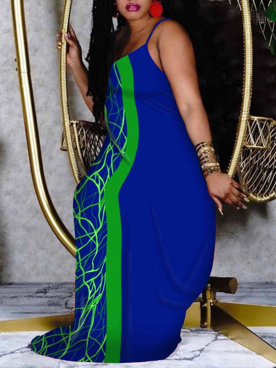 Striped Halter Spaghetti Strap Patchwork Graffiti/ Green & Deep Blue Floor Length Maxi Dress to 5X Plus Size
