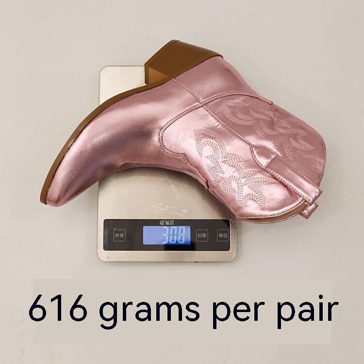Metallic Patent Leather Embroidered Pointed Toe Chunky Heel Ankle Western Cowgirl Boots