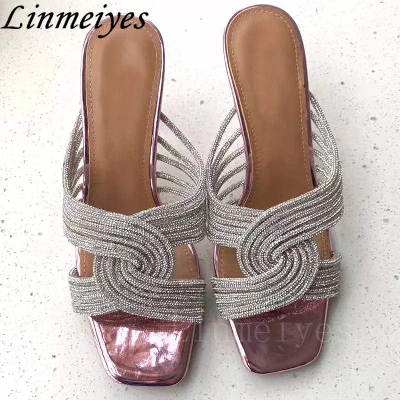 Rhinestone Mules High Heels Sandals Women Peep Toe Summer Party Shoes Woman Crystal Cross Strap Slides Sexy Slippers Women