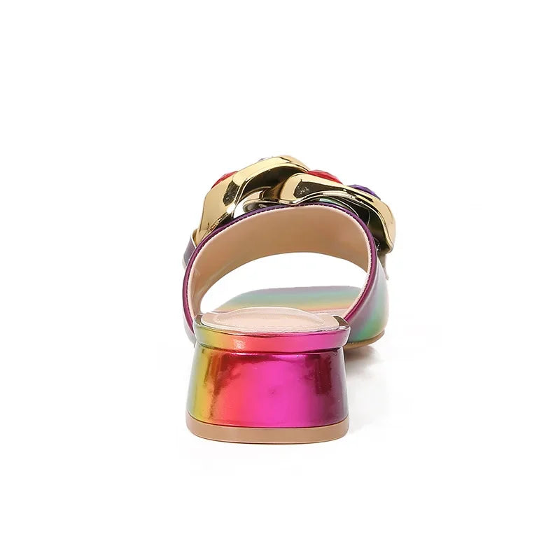 Gold Chain Detail Gradient Ombre Pattern Open Toe Women's Flat Square Heel Sandals
