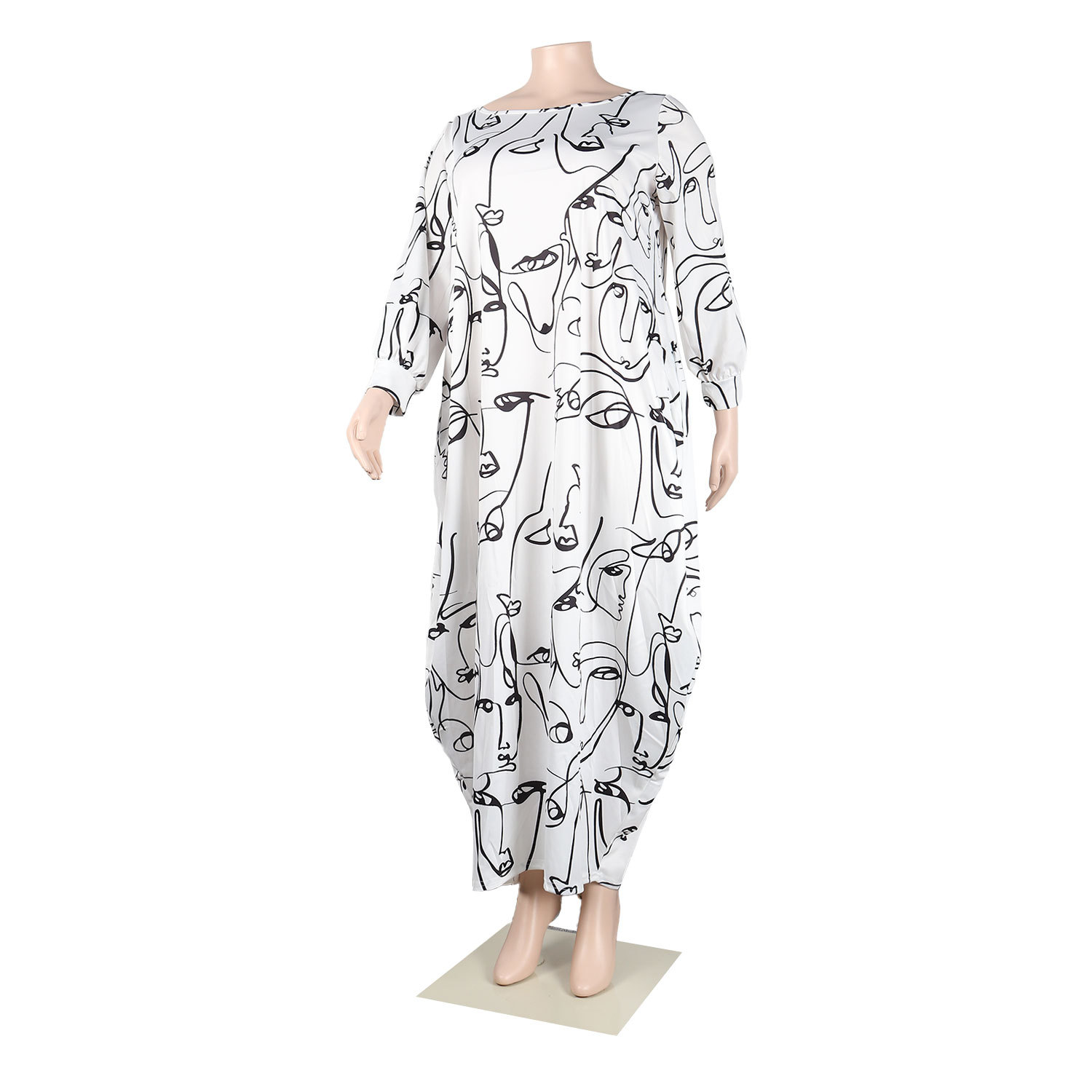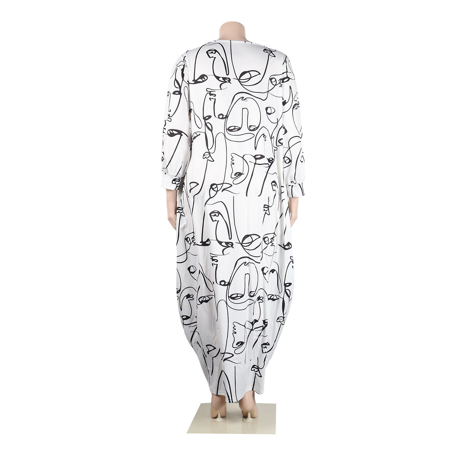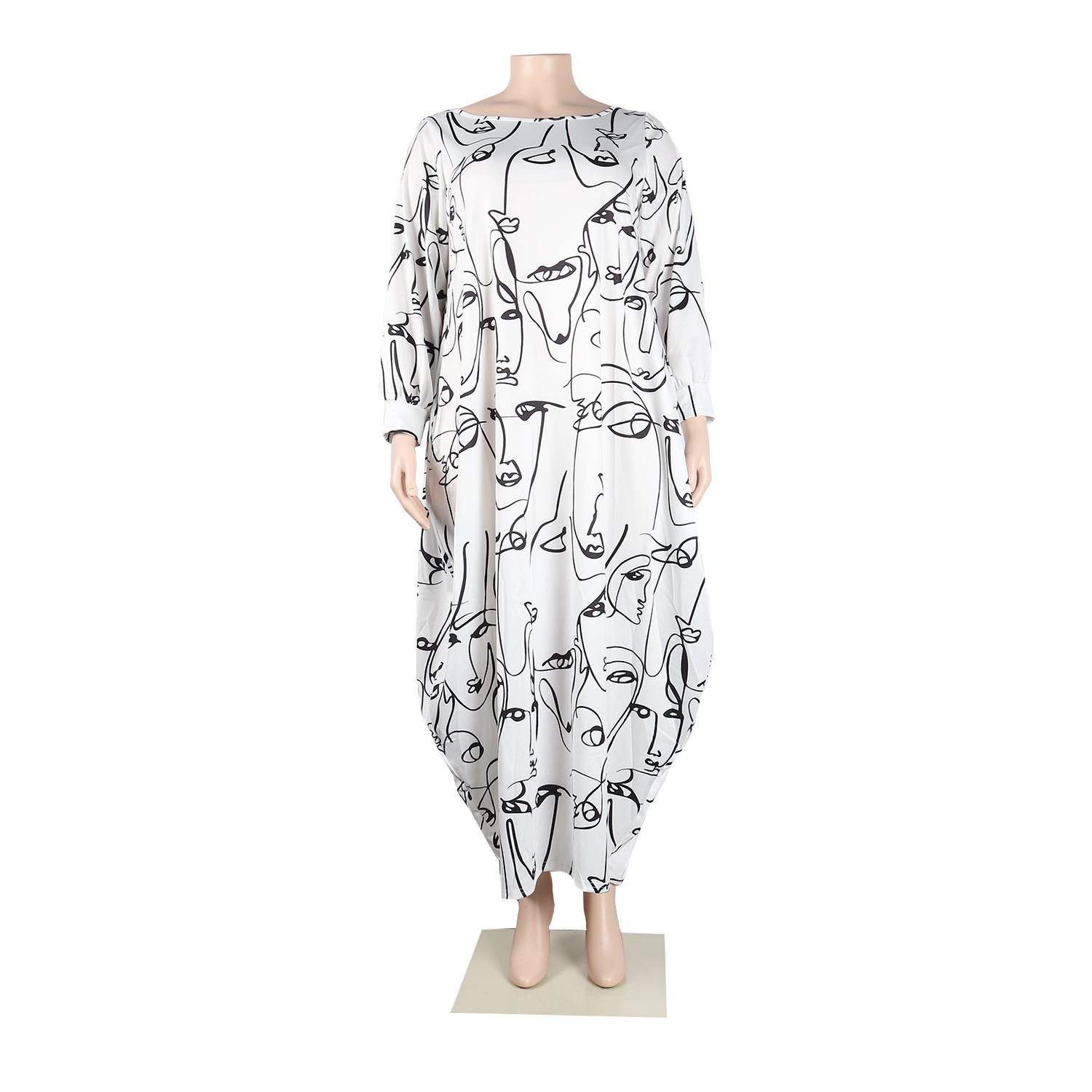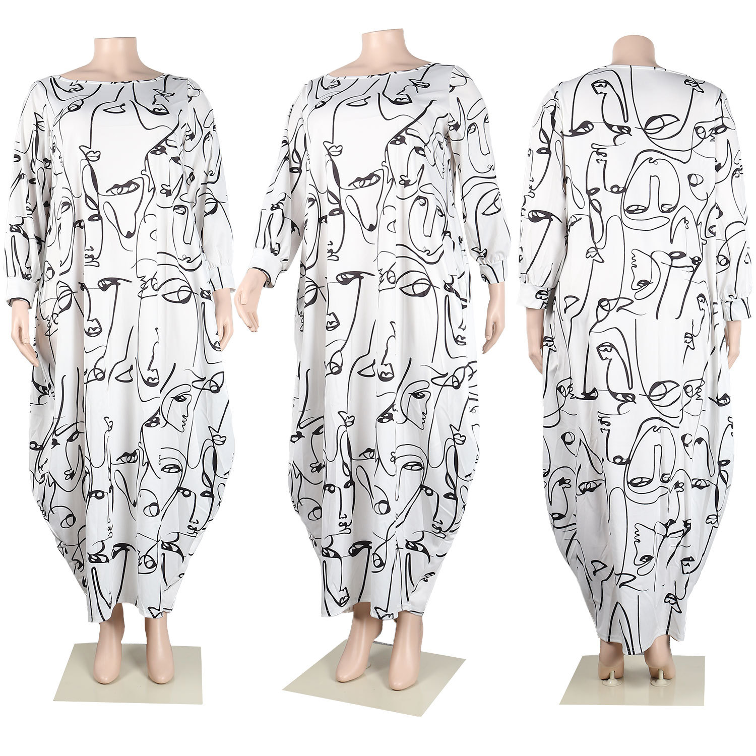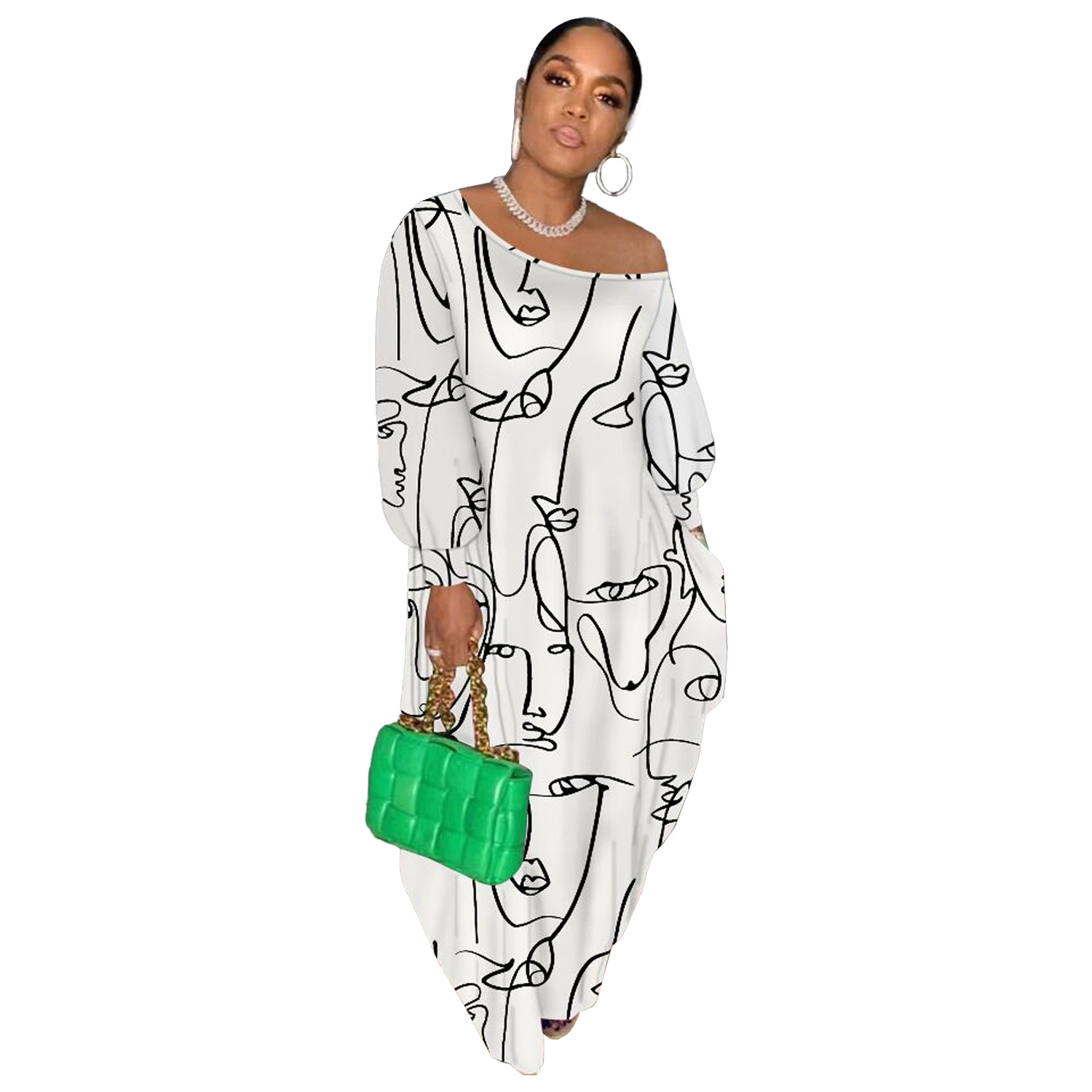 Loose Printed O Neck Off Shoulder Long Sleeve Maxi Dress