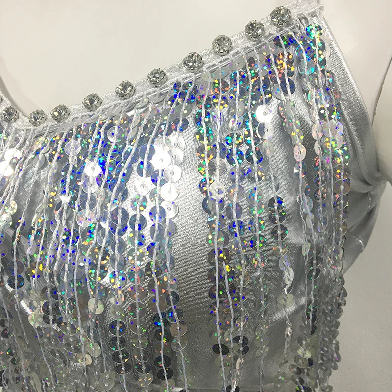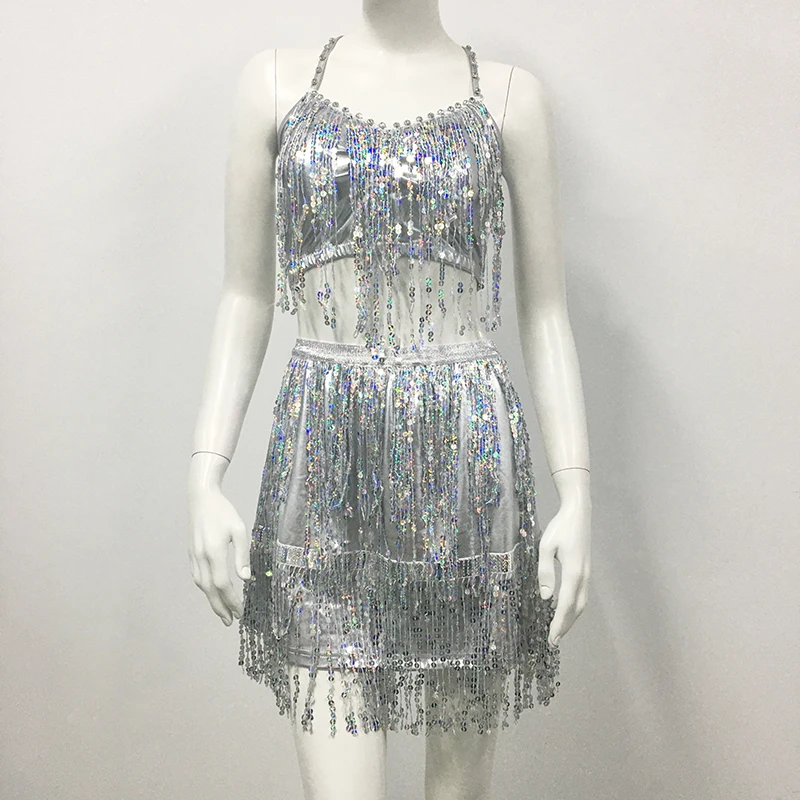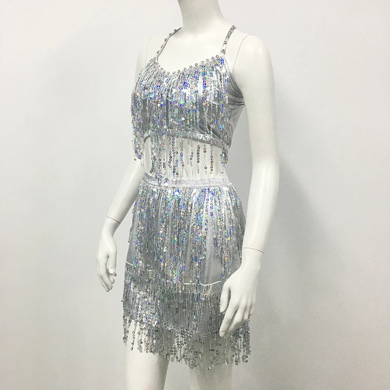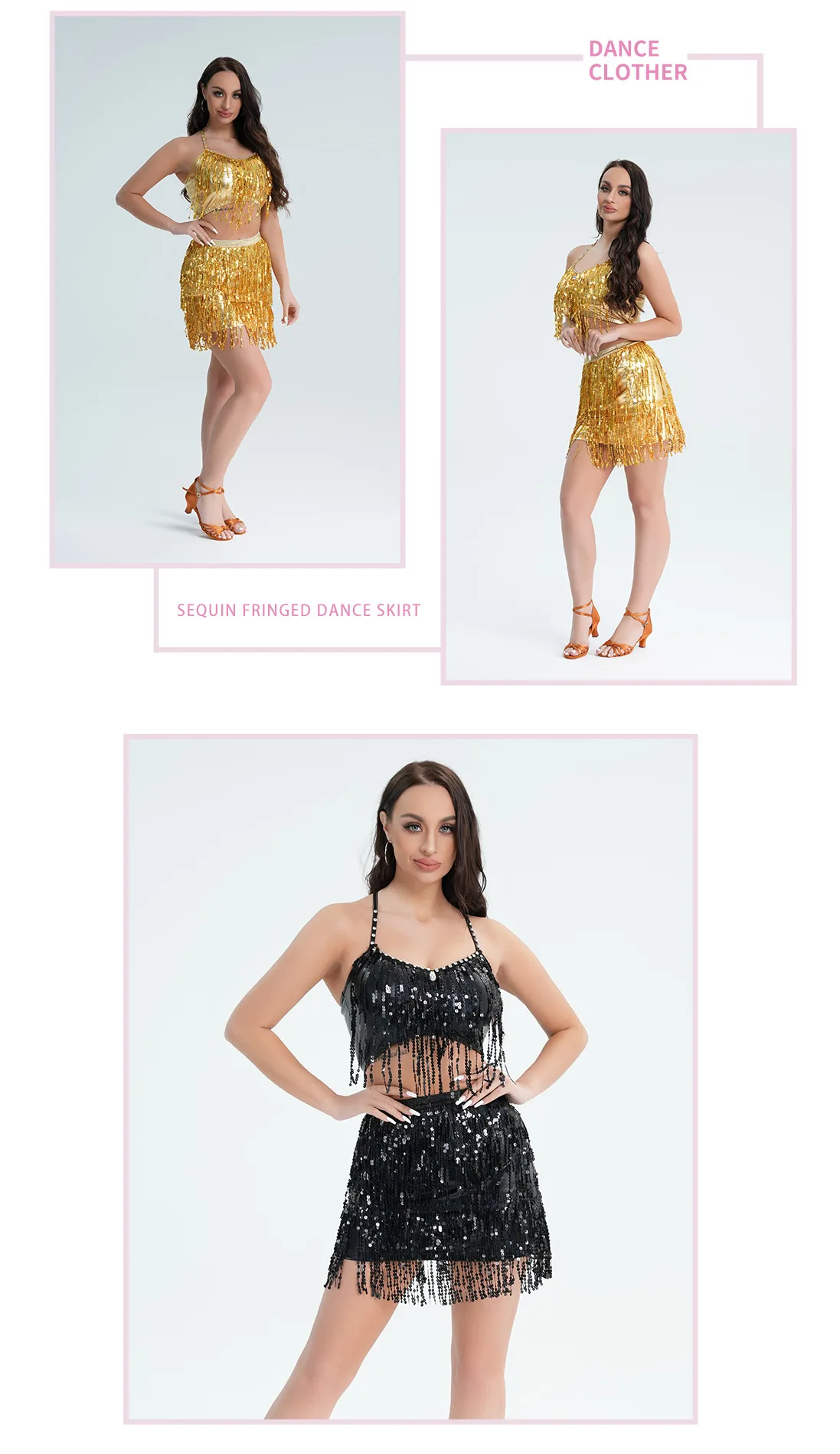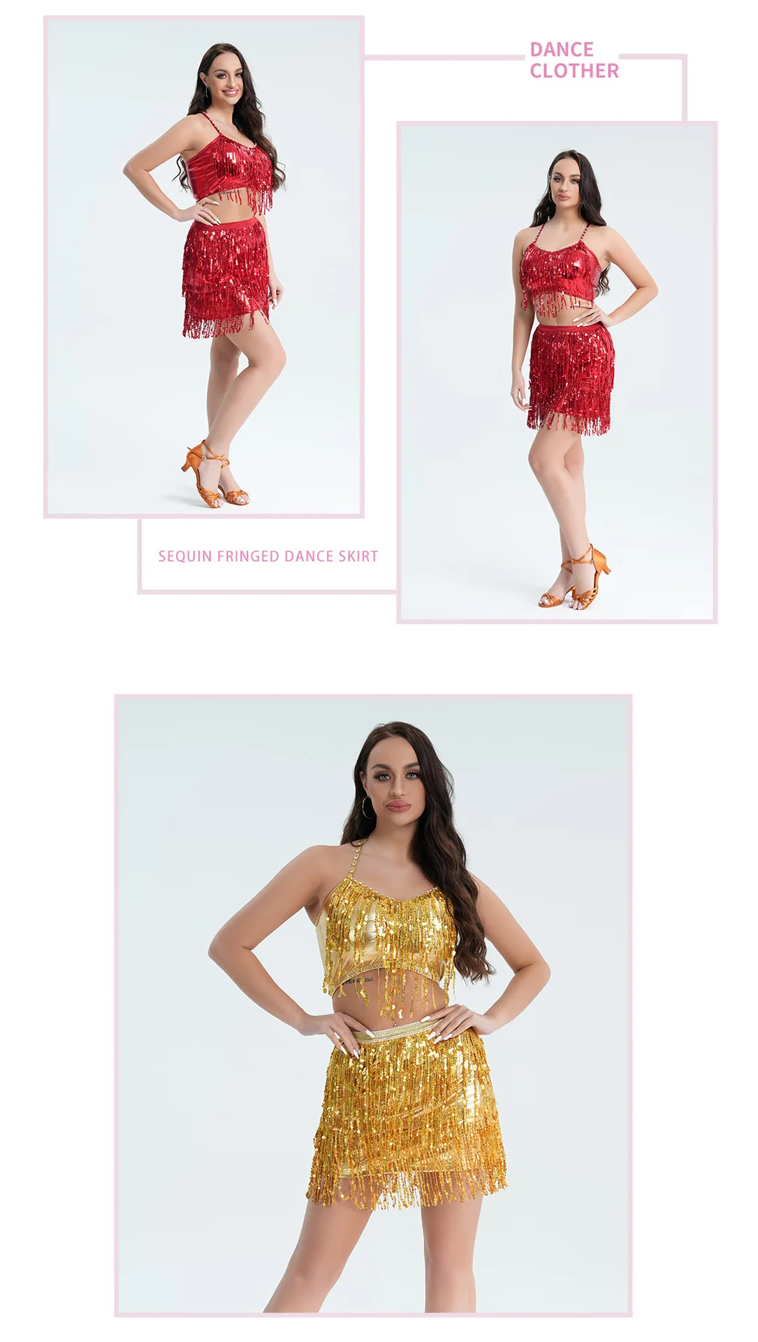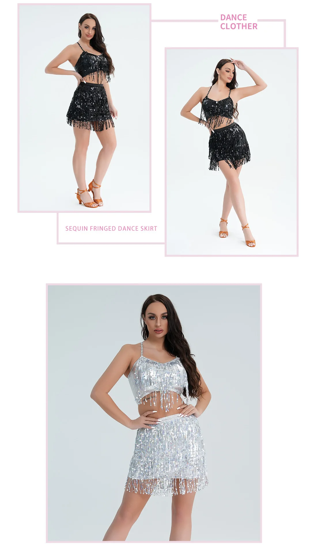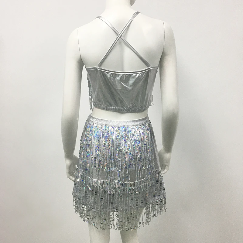 Sequin Metallic Tassel Crop Tank Top + Elastic Waist Fringe Mini Skirt 2-Piece Set