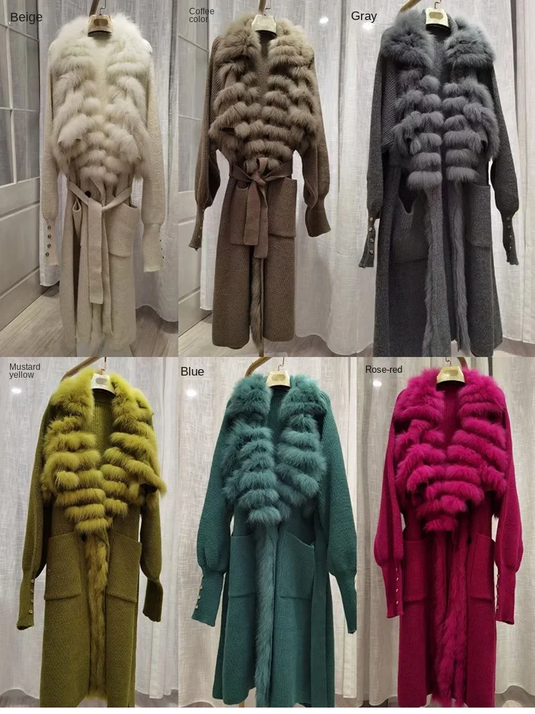Women's Real Fox Fur Collar Knitted Oversized Maxi Cardigan Sweater Trenchcoat w/ Belt