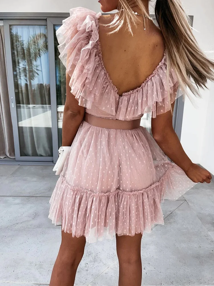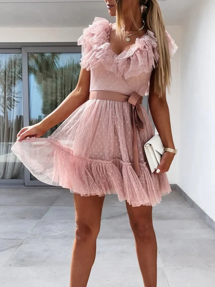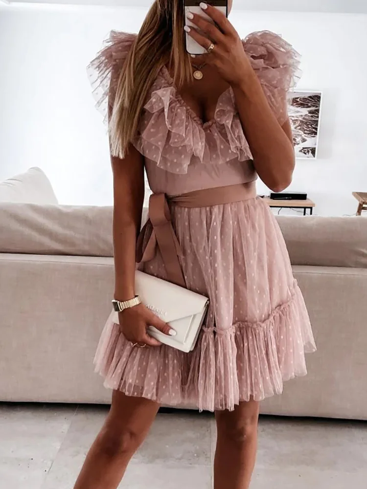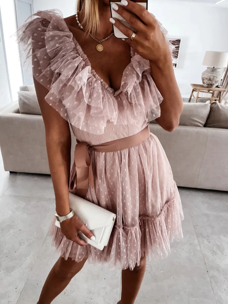 Deep V-Neck Gauze Elegant Solid Sleeveless Knee-Length Sweet Dress