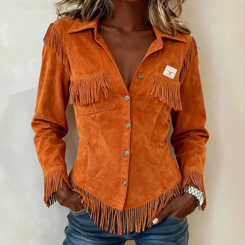 Orange Western Suede Velvet Tassel Fringe Design Long Sleeve Women's Rodeo Shirt