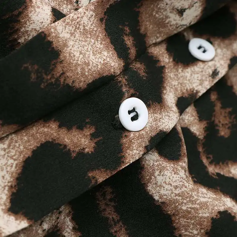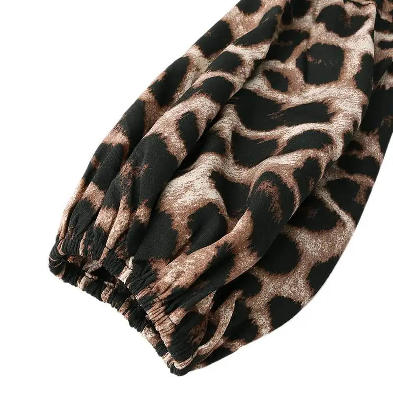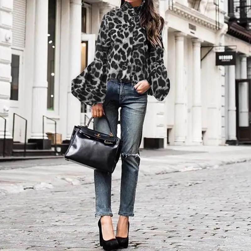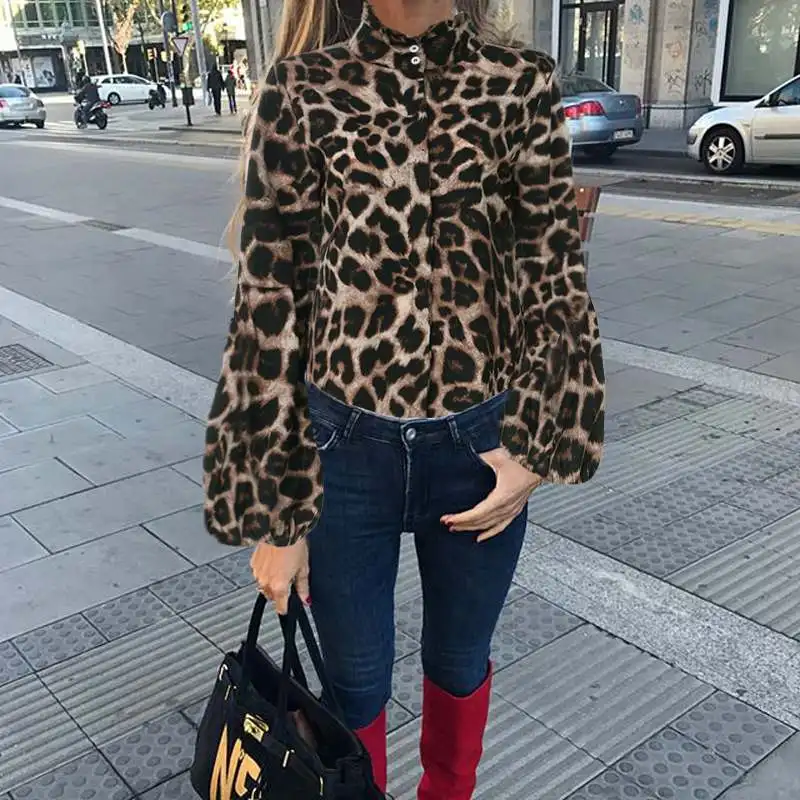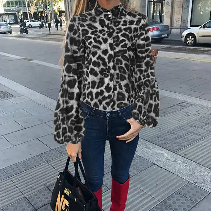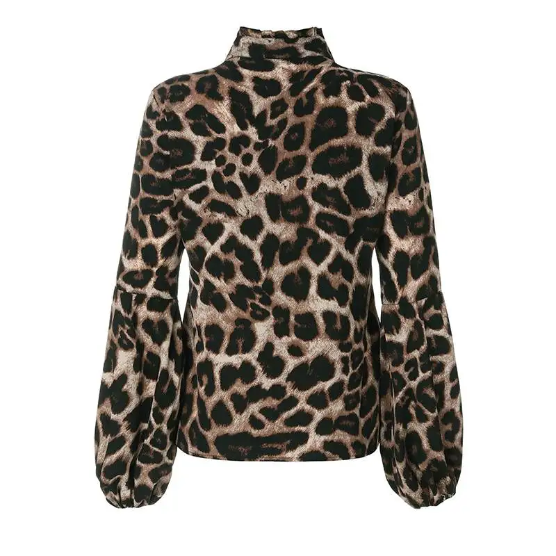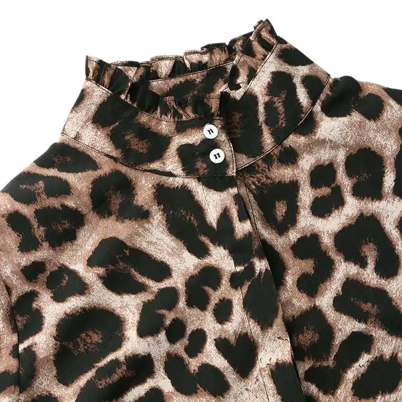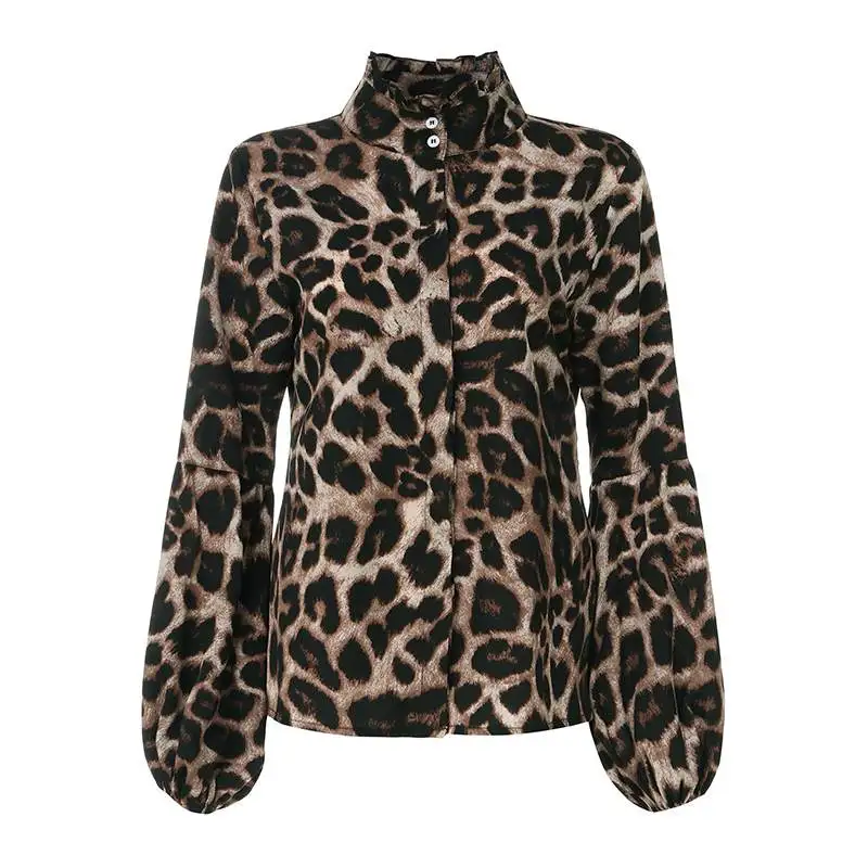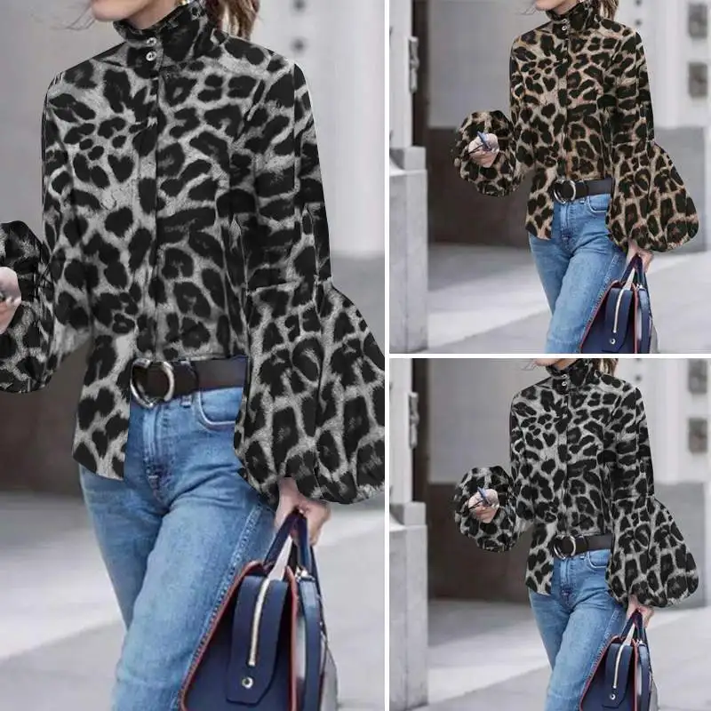 Leopard Print Lantern Sleeve High Collar Ruffled Sleeve Blouse to 5X Plus Size