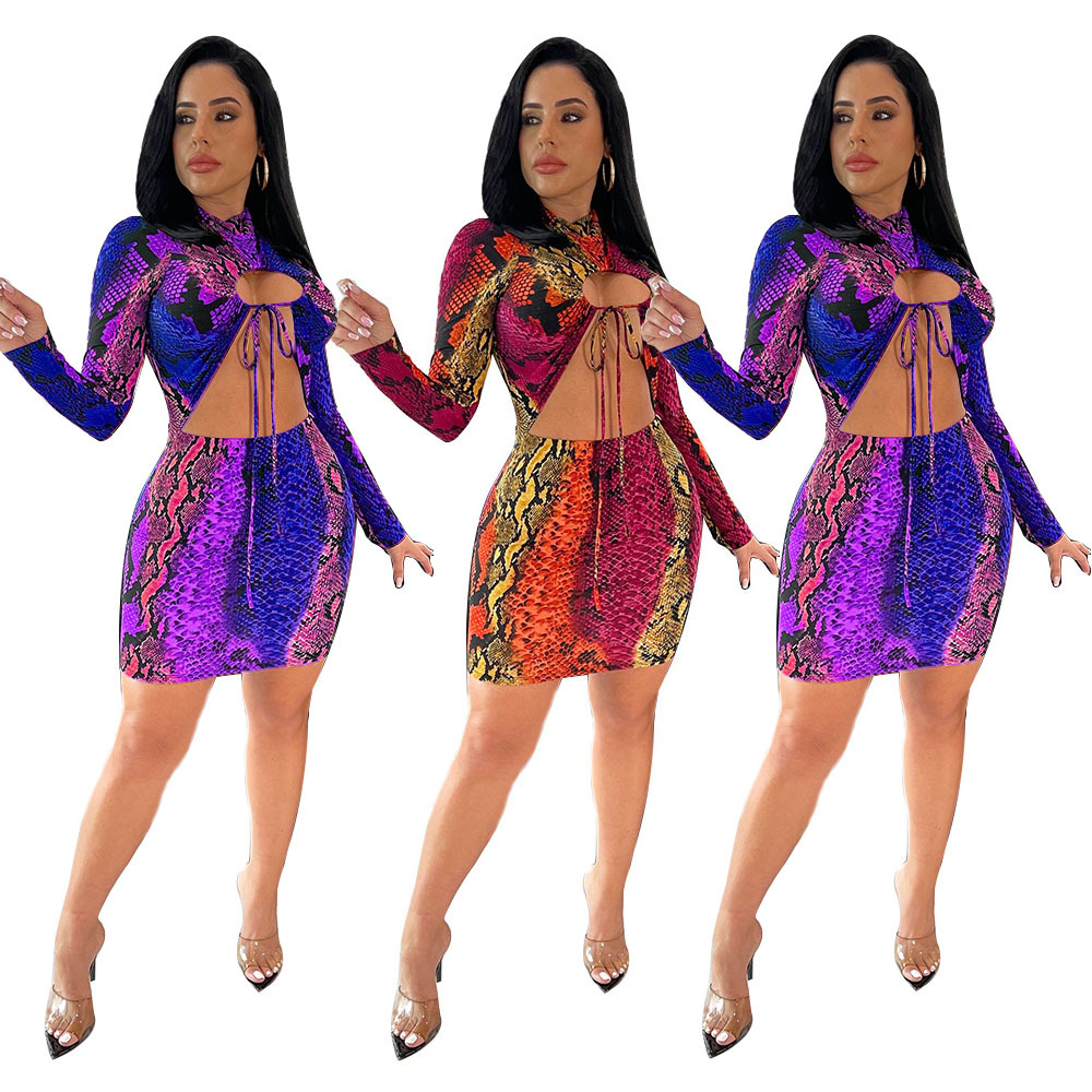 Snake Print Lace-Up Colorblock Long Sleeve Hollow-Out Mini Club Dress