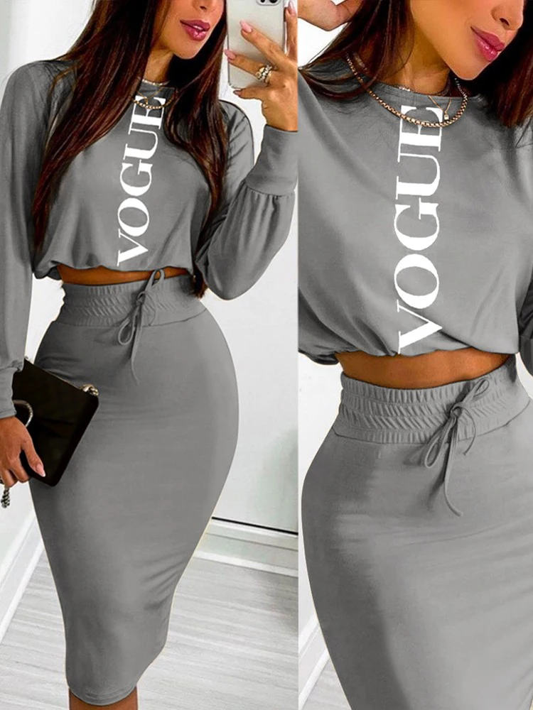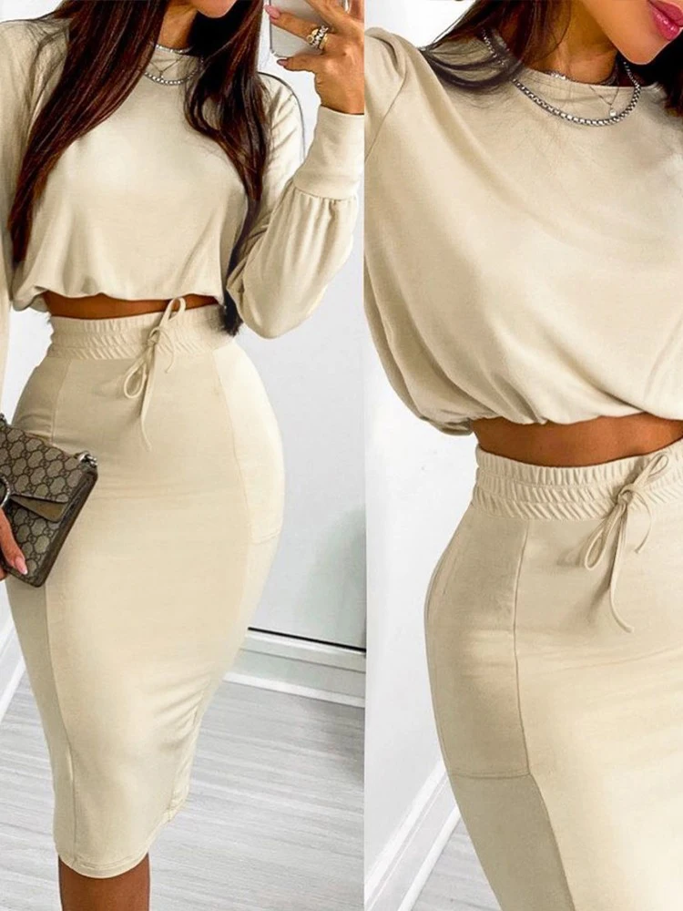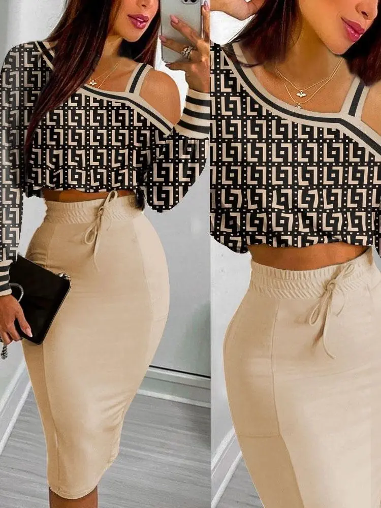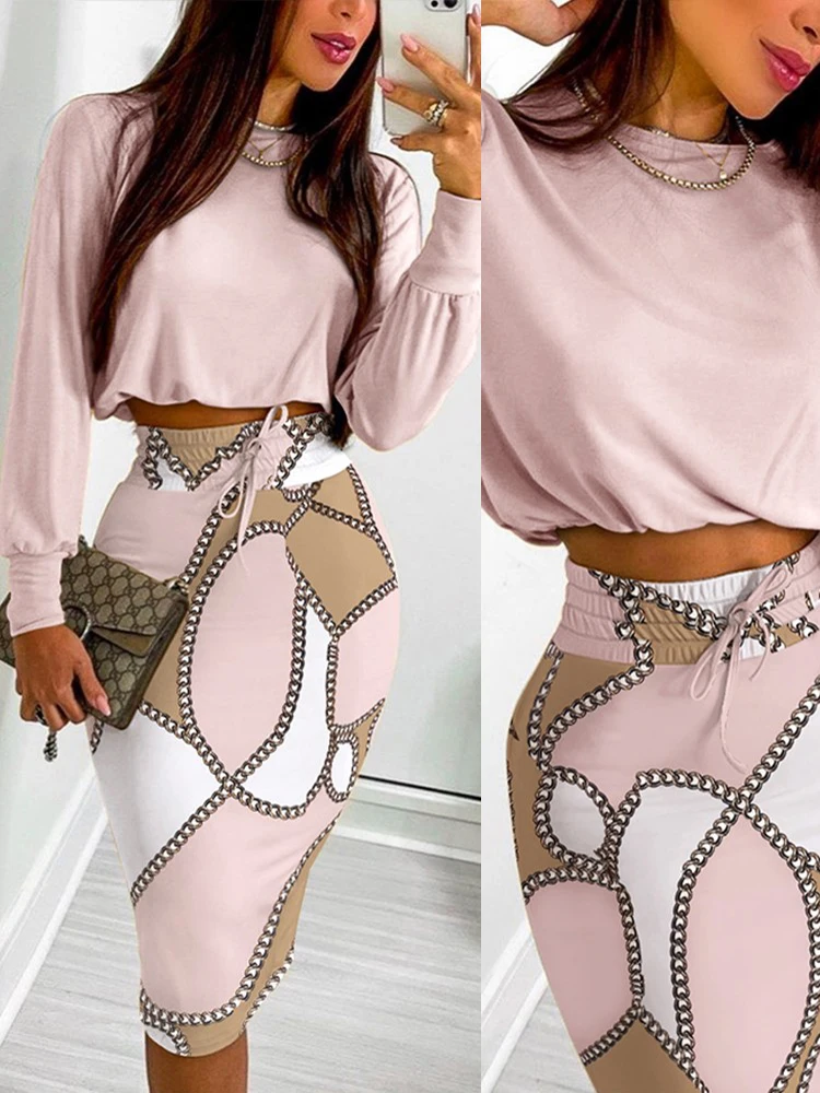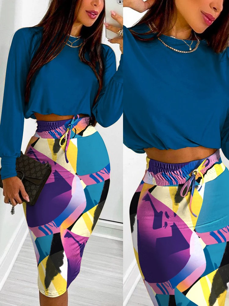 O-Neck Printed Long Sleeve Top & Drawstring Shirred Midi Skirt 2-Piece Set