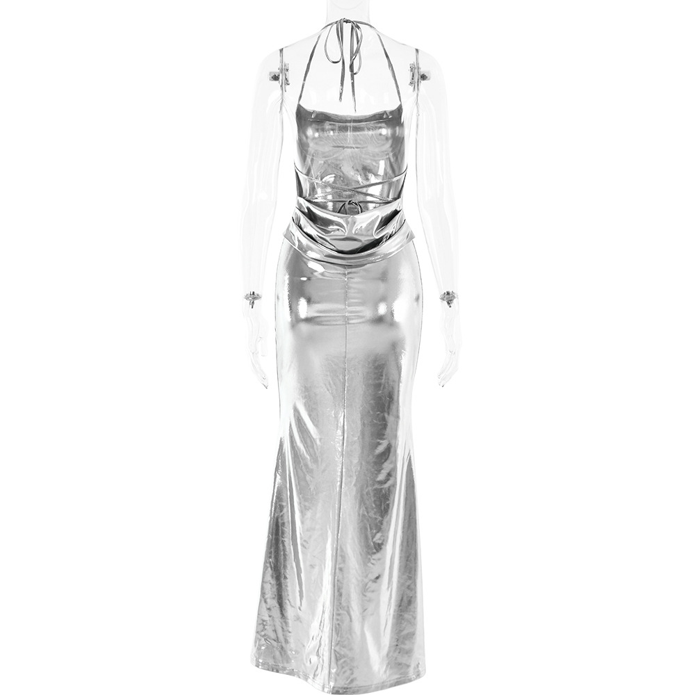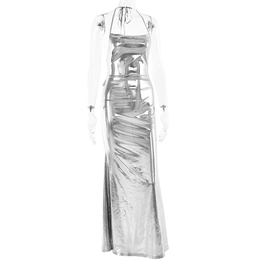 Metallic Silver/Gold Faux Leather Sleeveless Swing Collar Backless Lace-Up Skinny Formal Maxi Dress