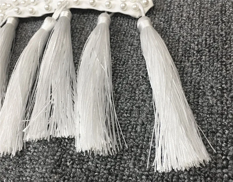 White Pearl Backless Beaded Rhinestone Tassel Fringe Formal Evening Party Dress