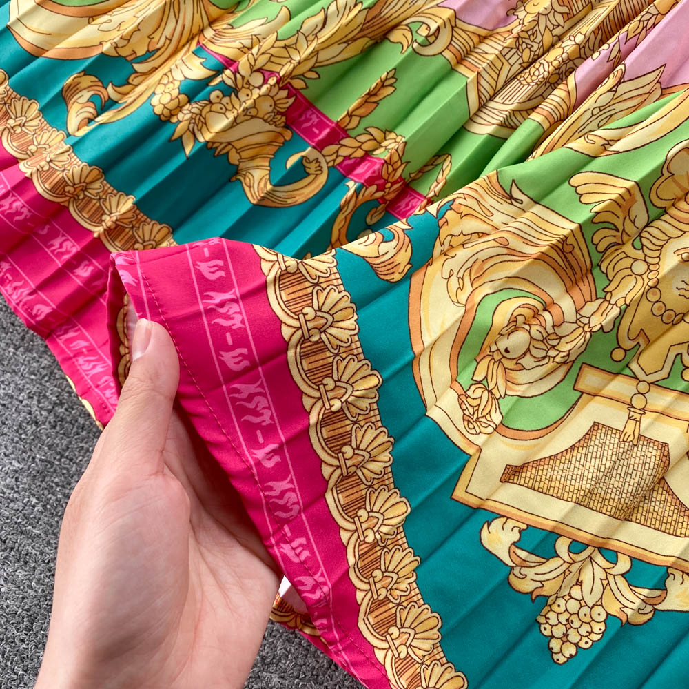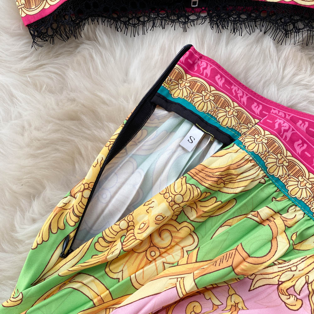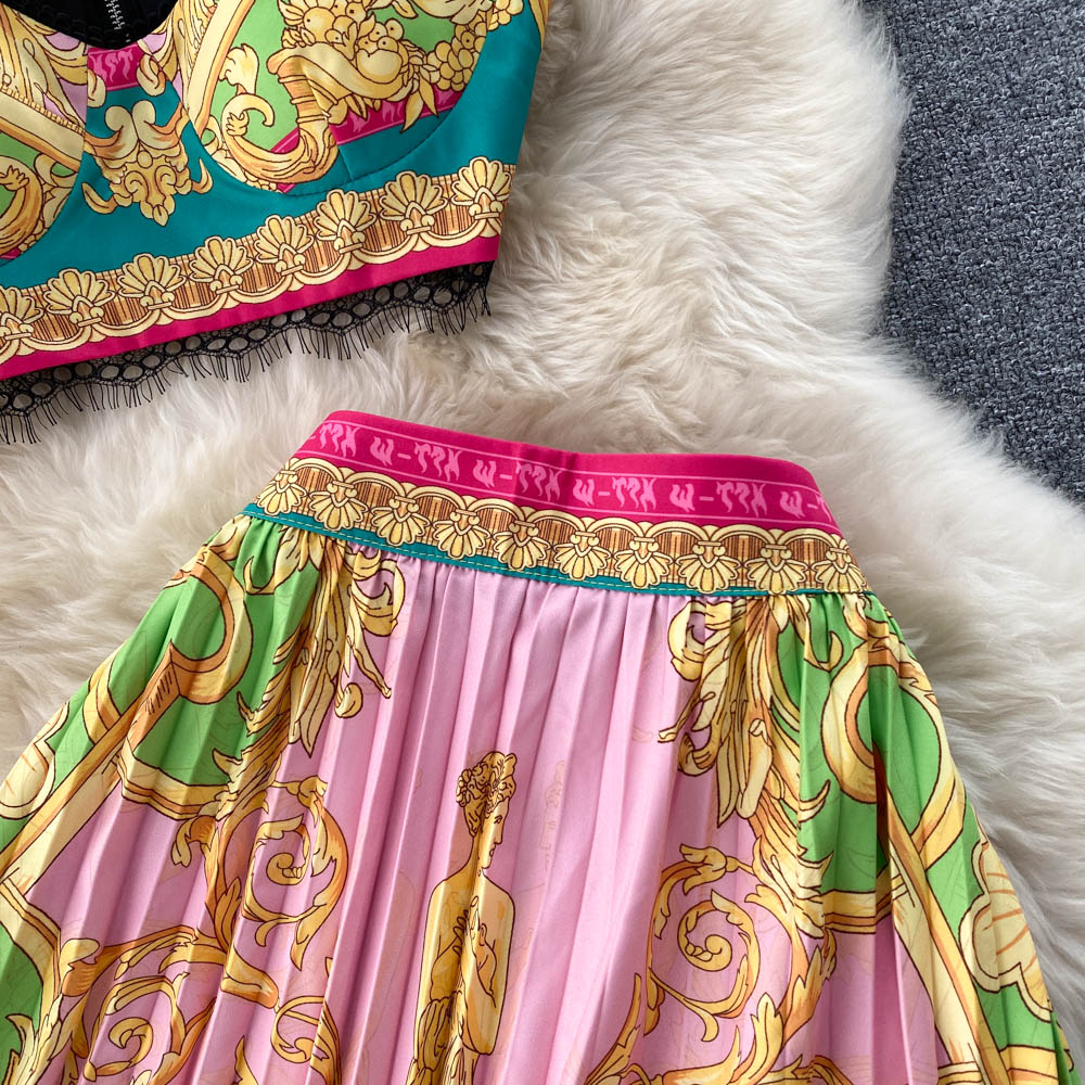 Baroque Lace Stitched Floral Print Crop Tank Top + Pleated Maxi Skirt Women's 2-Piece Set