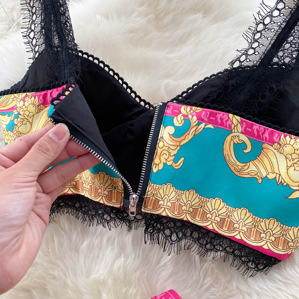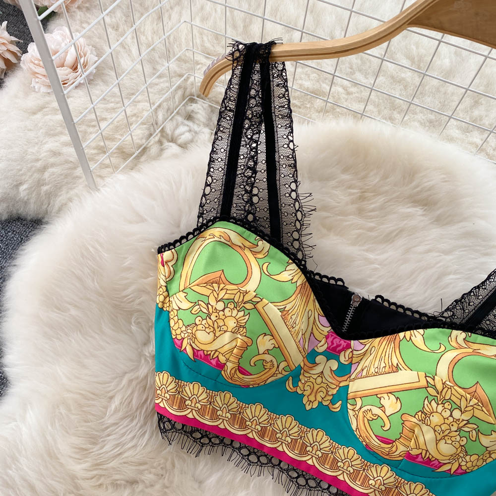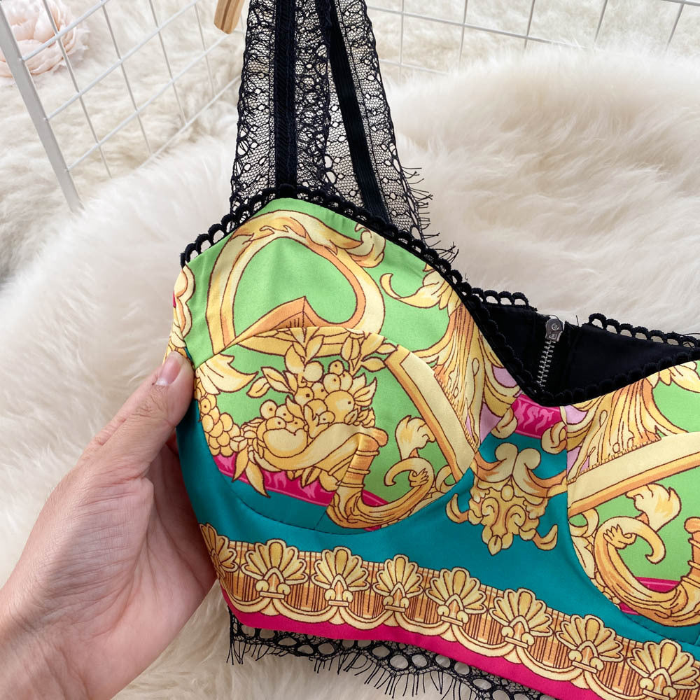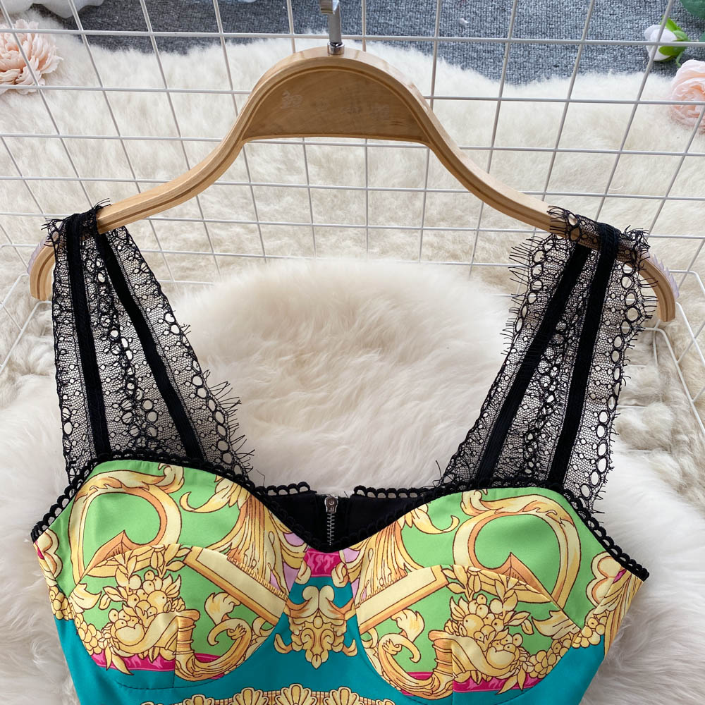 Baroque Lace Stitched Floral Print Crop Tank Top + Pleated Maxi Skirt Women's 2-Piece Set