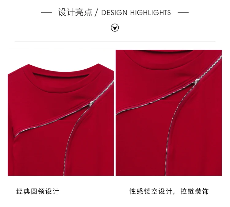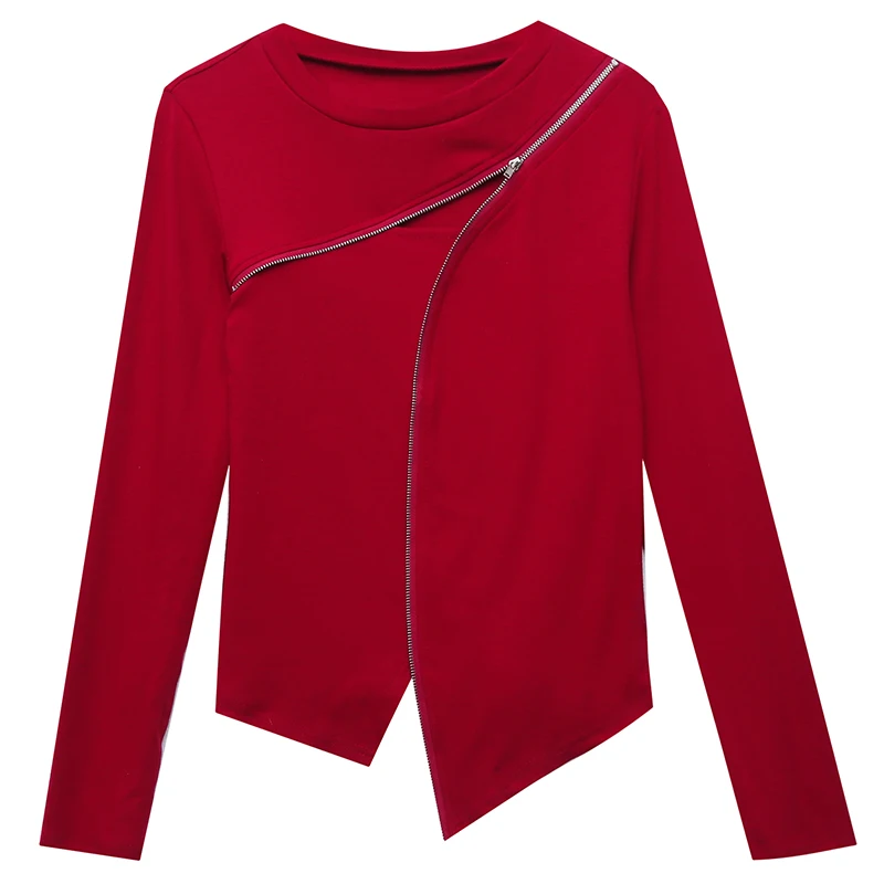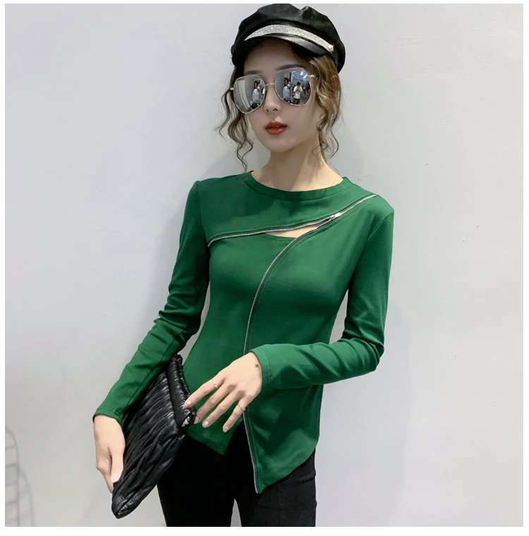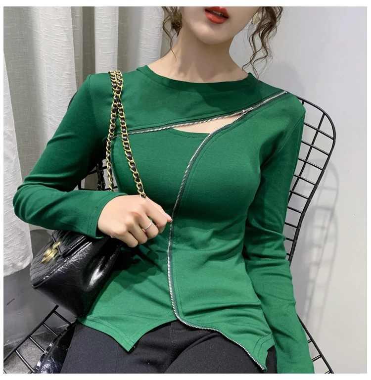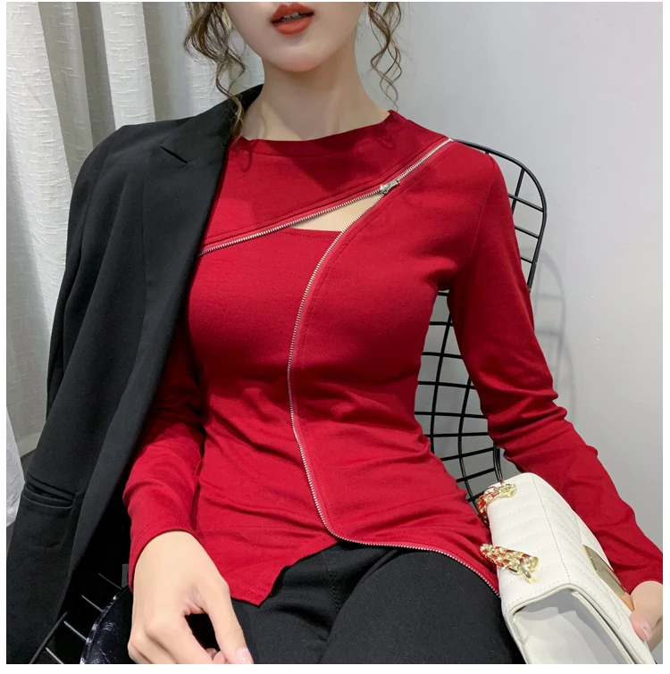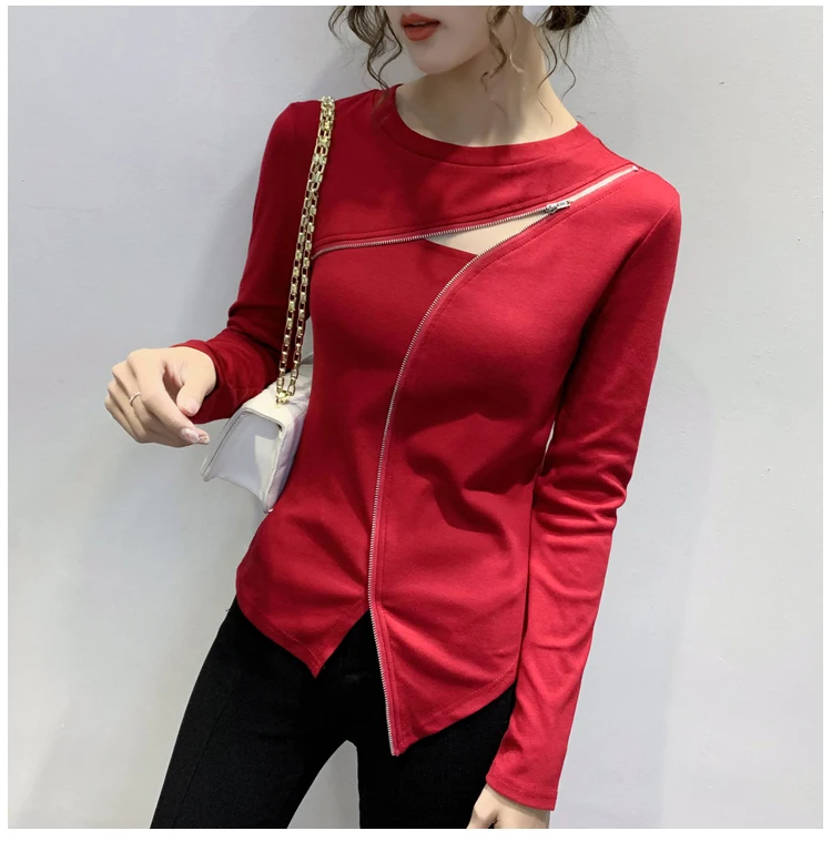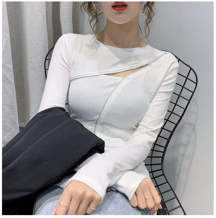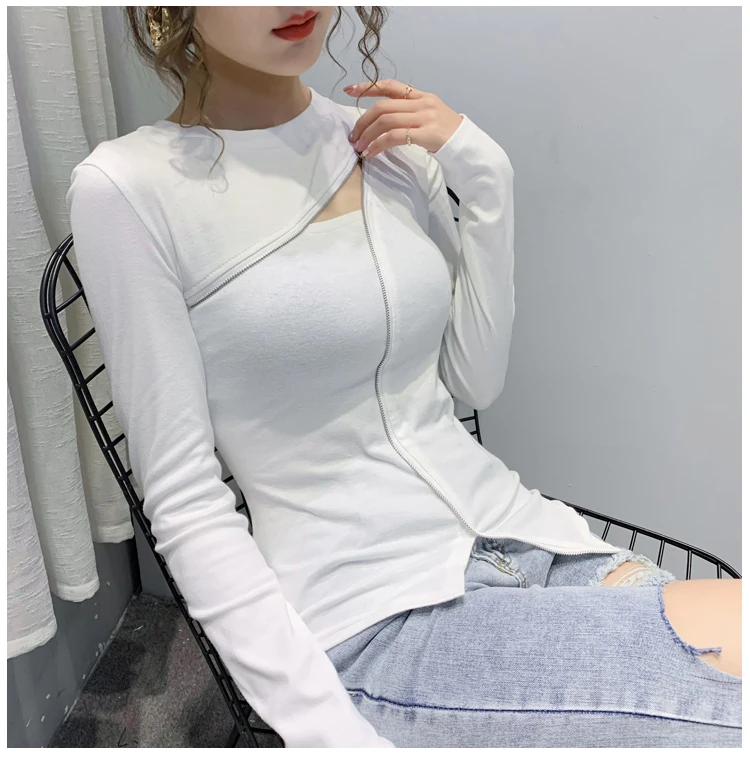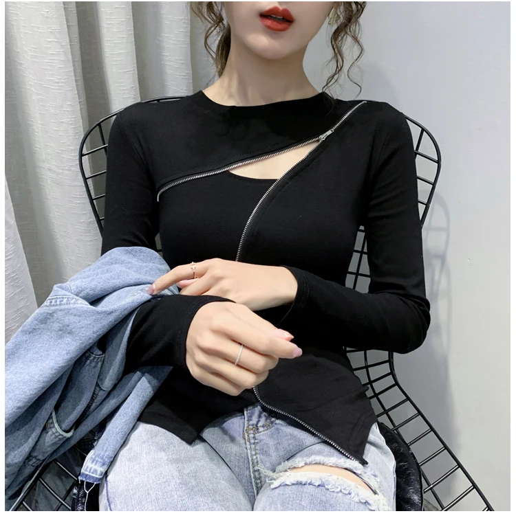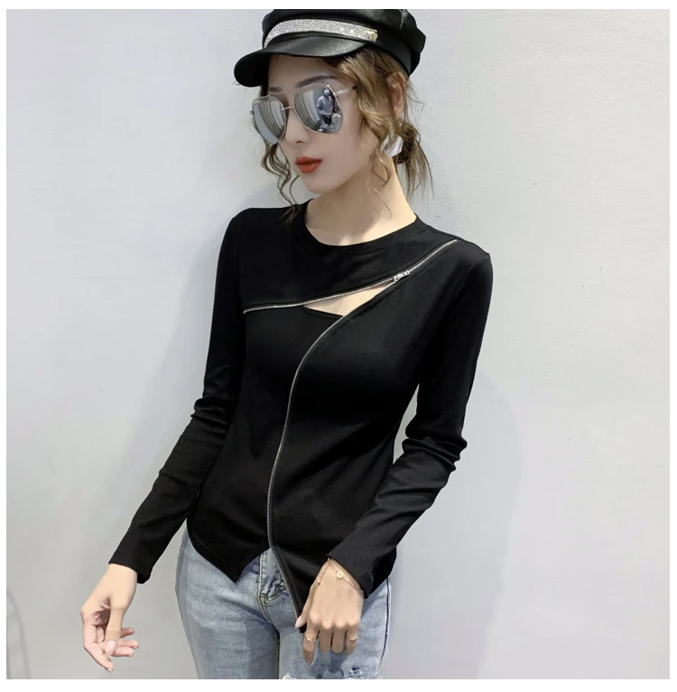 Long Sleeve Basic T-shirt Women Spring/Fall Streetwear Cut-out Hollow Out Cotton Tshirt Girls Tees Tops with Zipper New T07611B