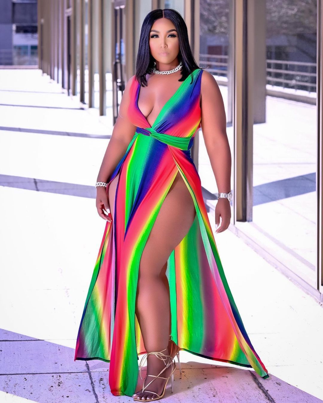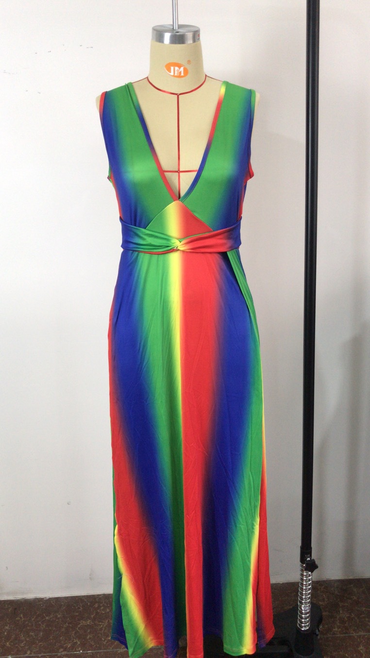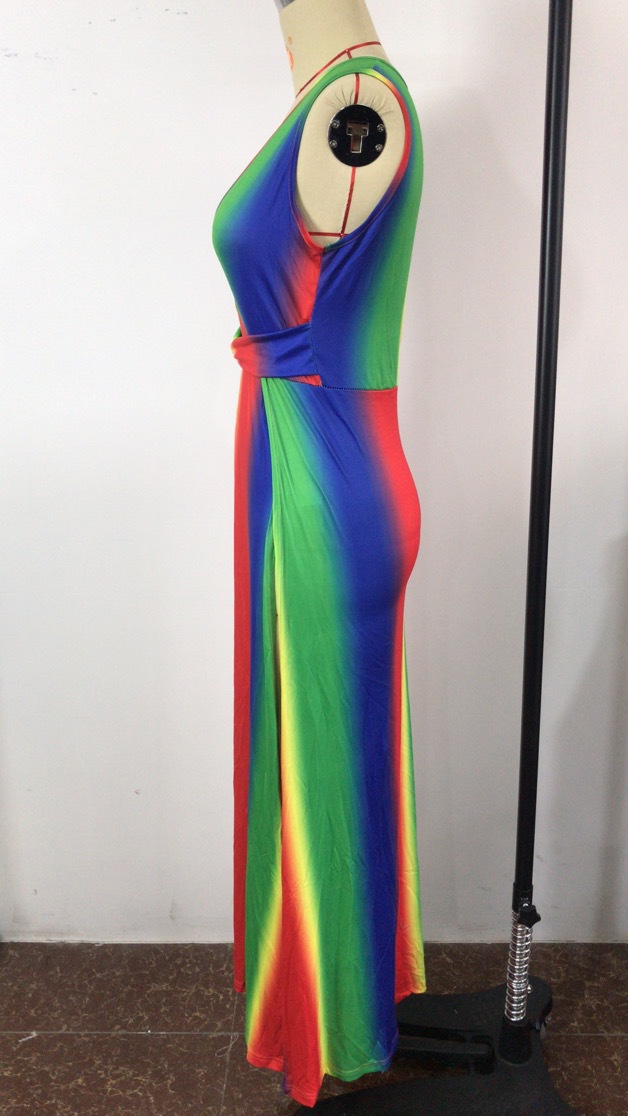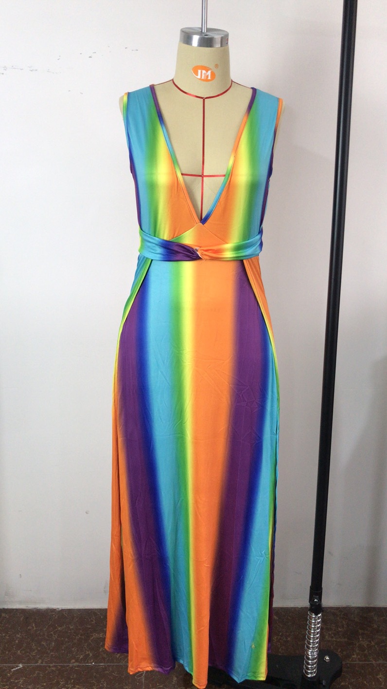 Rainbow Striped Multicolor Big Swing V-Neck Sleeveless Spaghetti Strap Double High Side Slit Maxi Sundress to 5X Plus Size