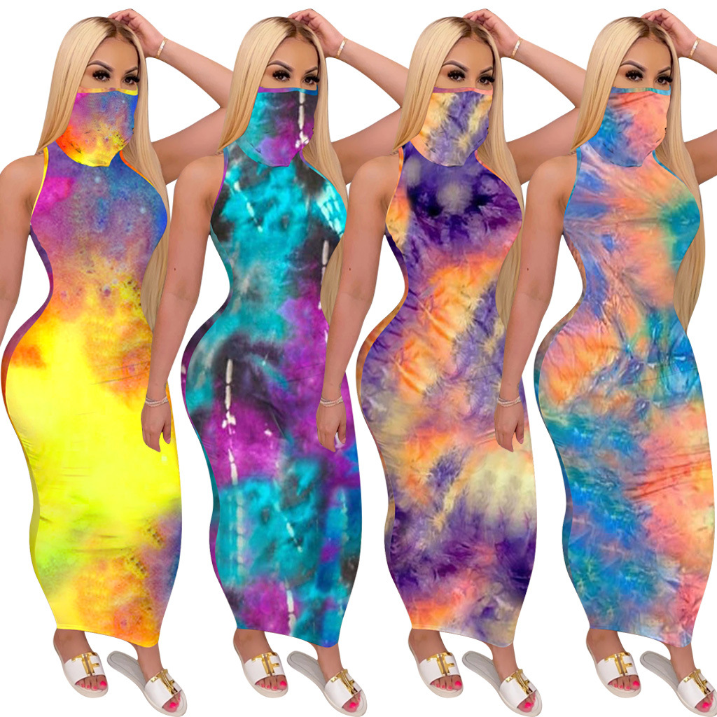 Tie-Dye Sleeveless O-Neck Bodycon Skinny Maxi Dress w/ Matching Mask