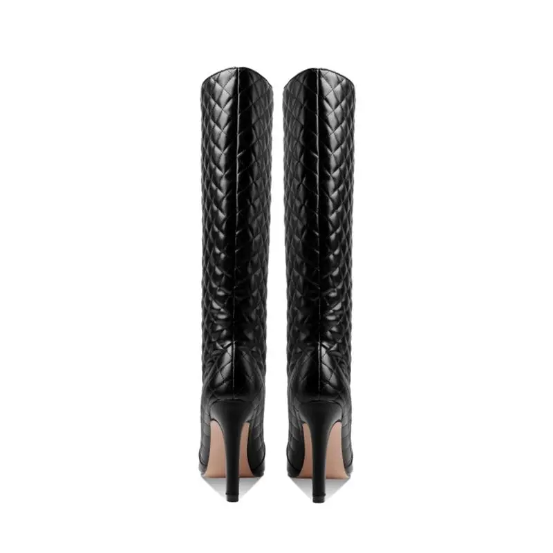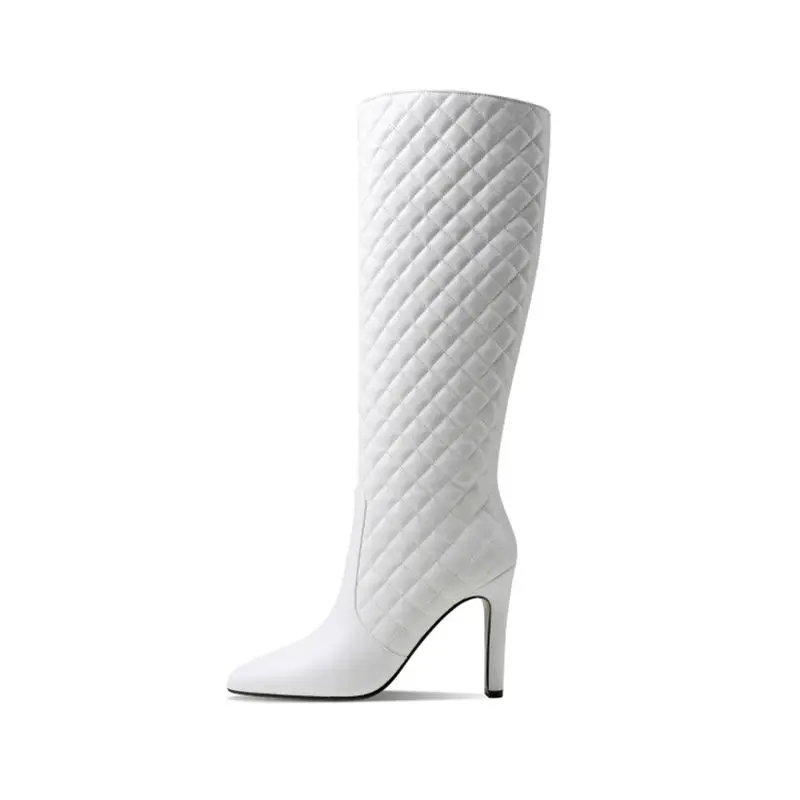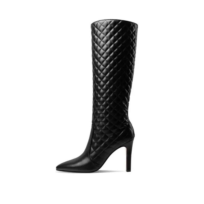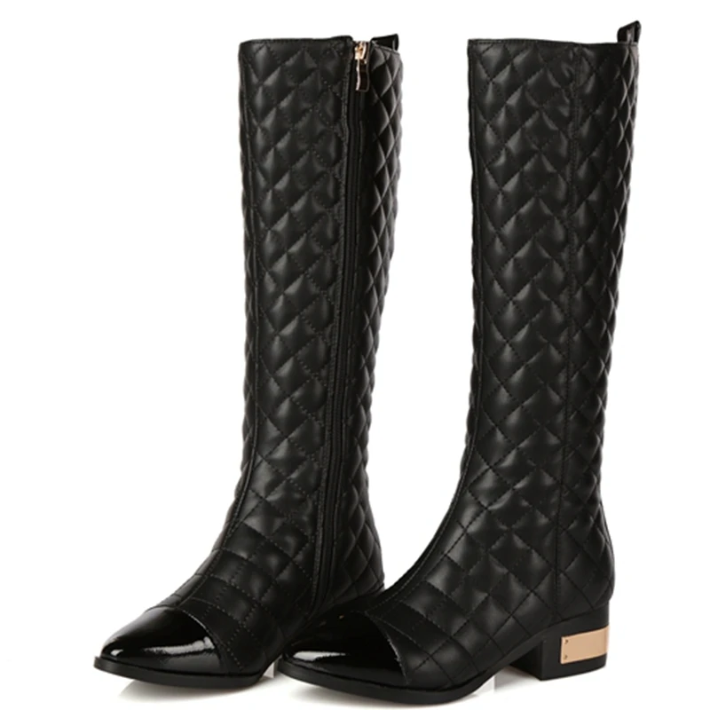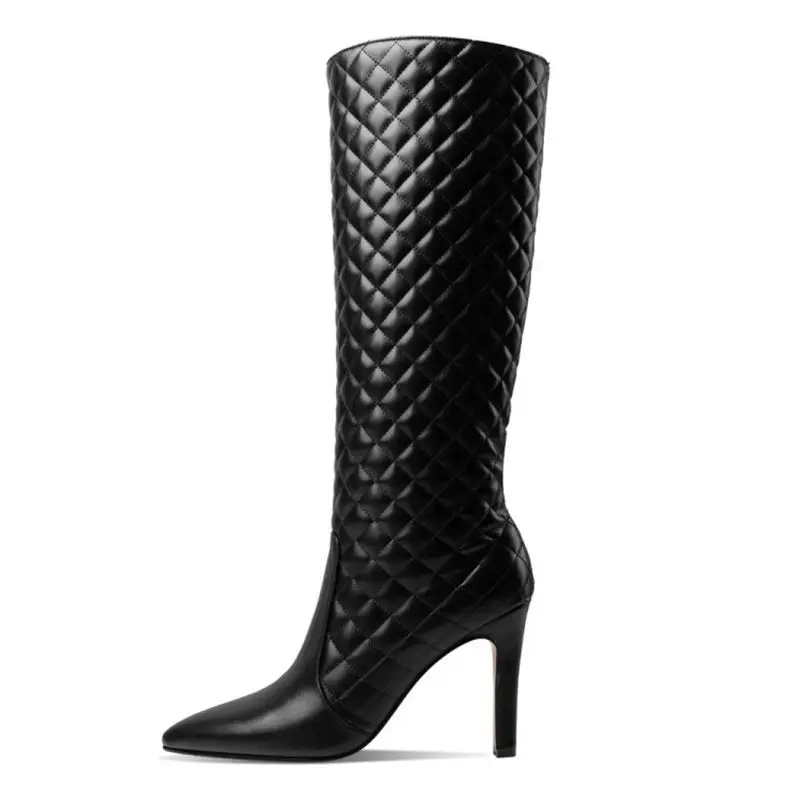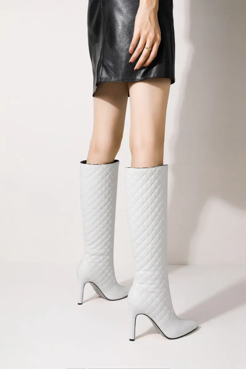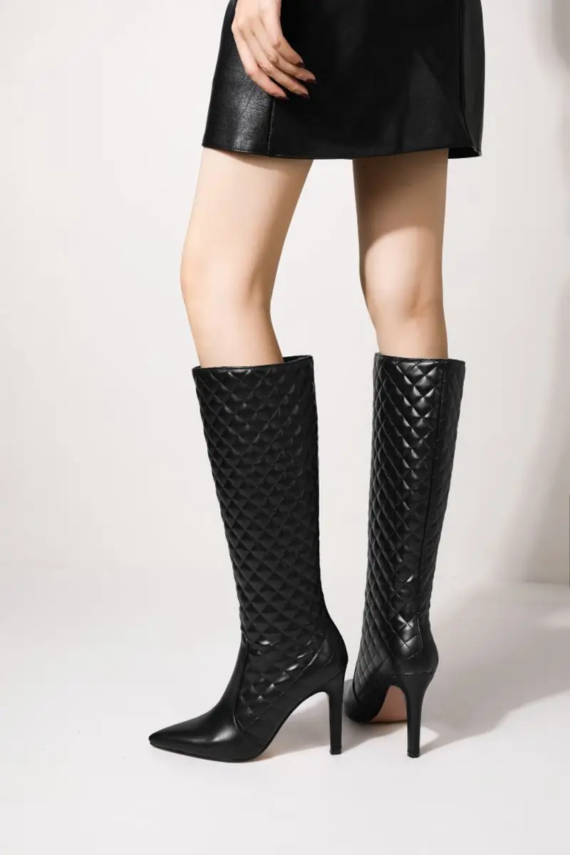 Quilted Genuine Leather Low Square Heel Knee High Boots