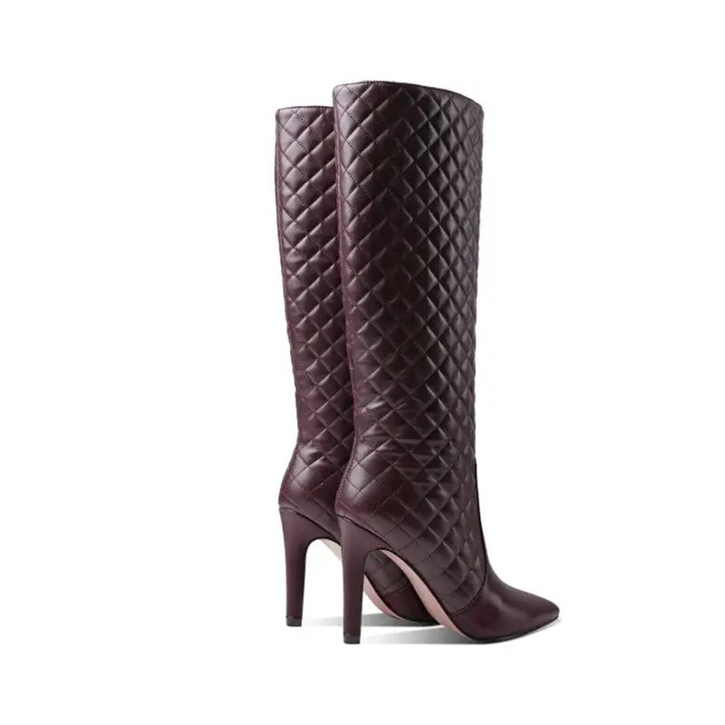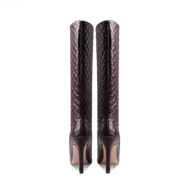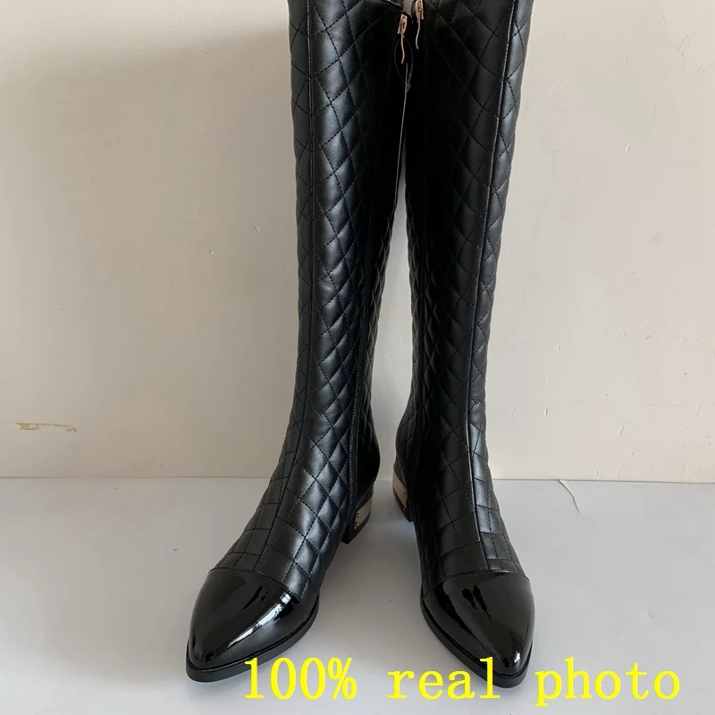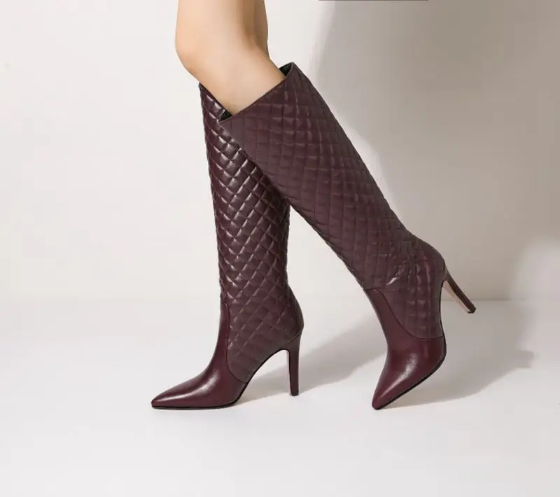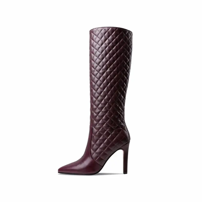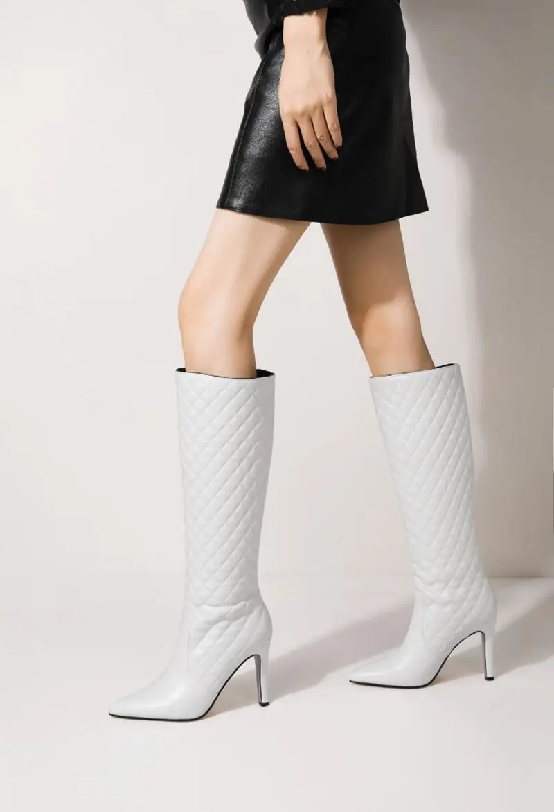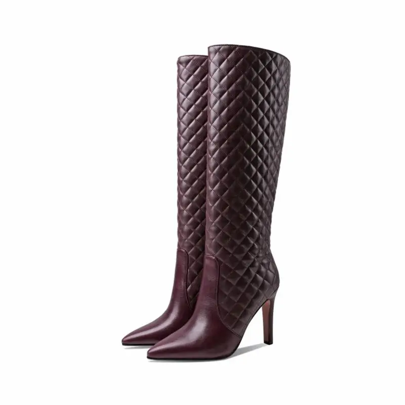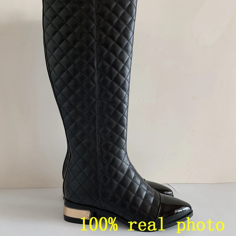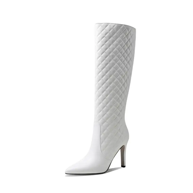 Quilted Genuine Leather Low Square Heel Knee High Boots