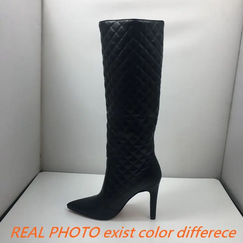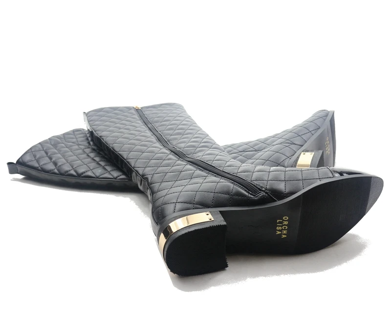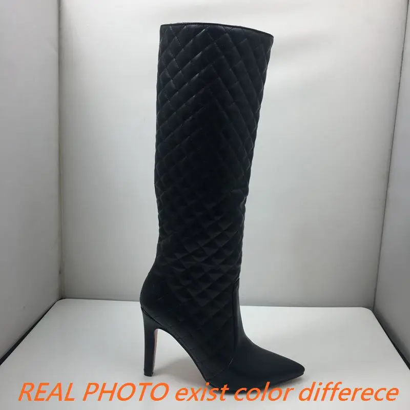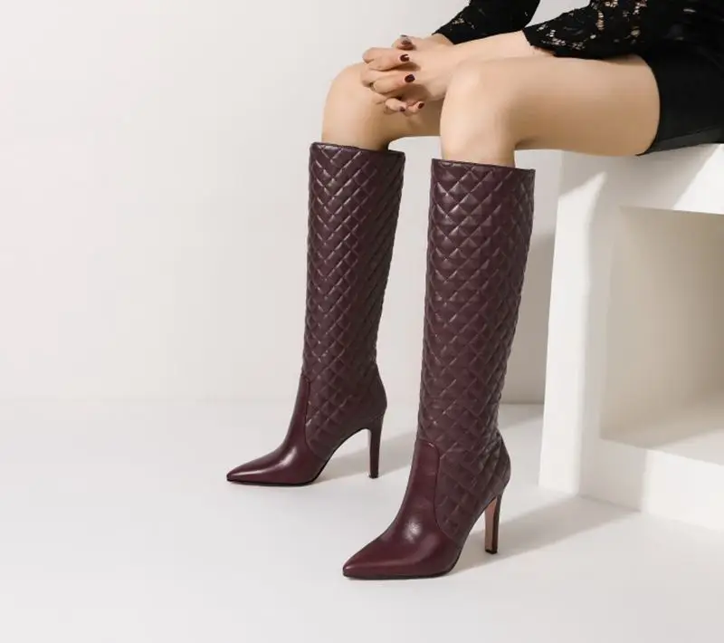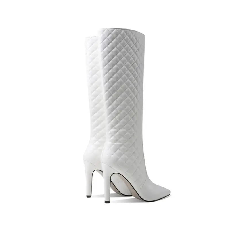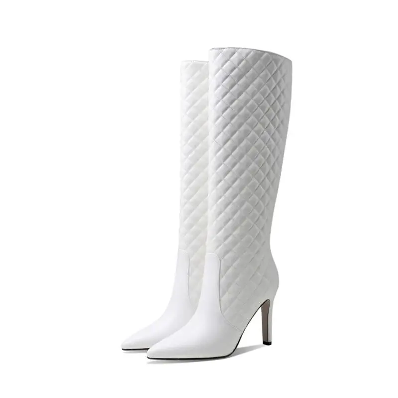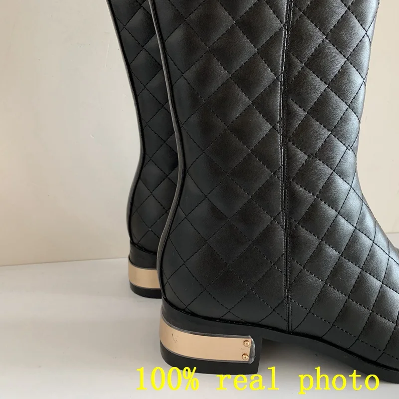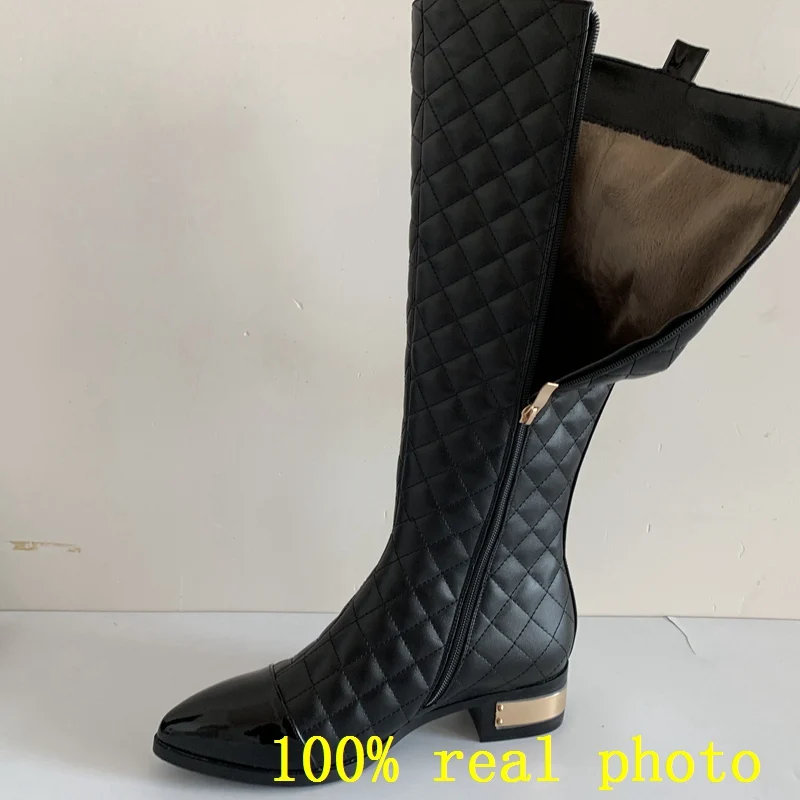 Quilted Genuine Leather Low Square Heel Knee High Boots
