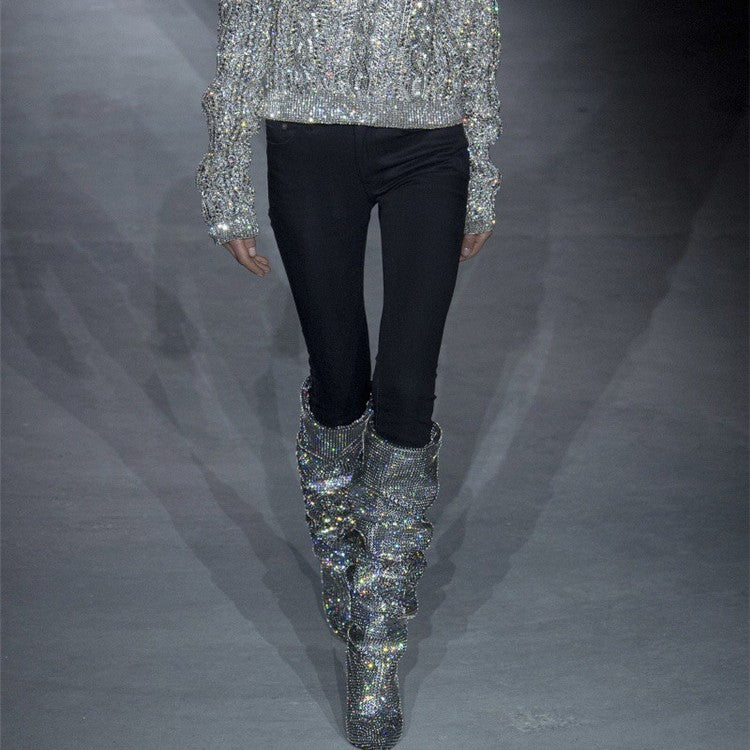 Silver/Black Diamond Metallic Sparkling Rhinestone High Heel Pointed Toe Knee-High Boots