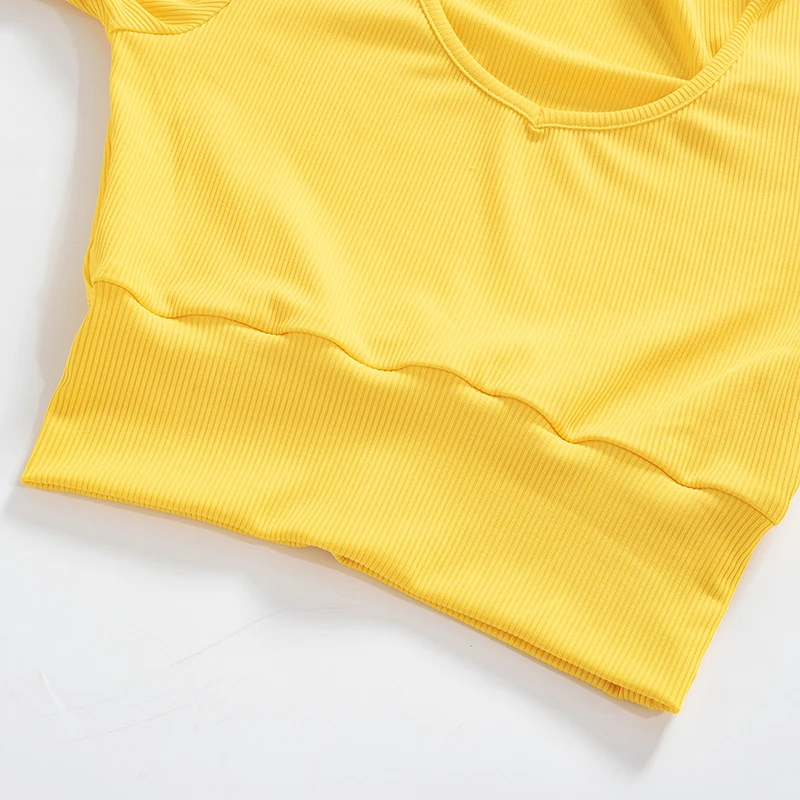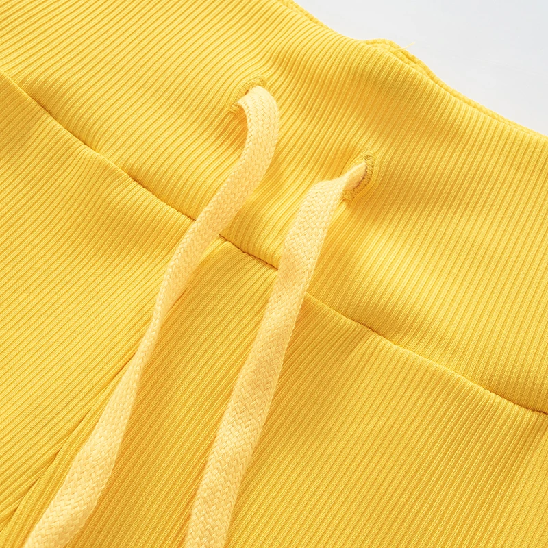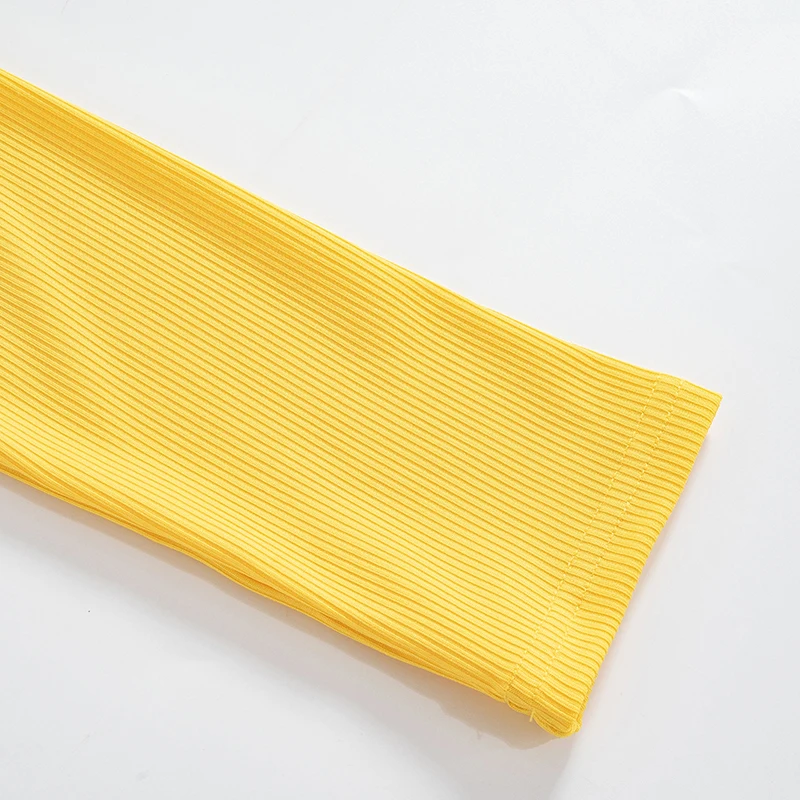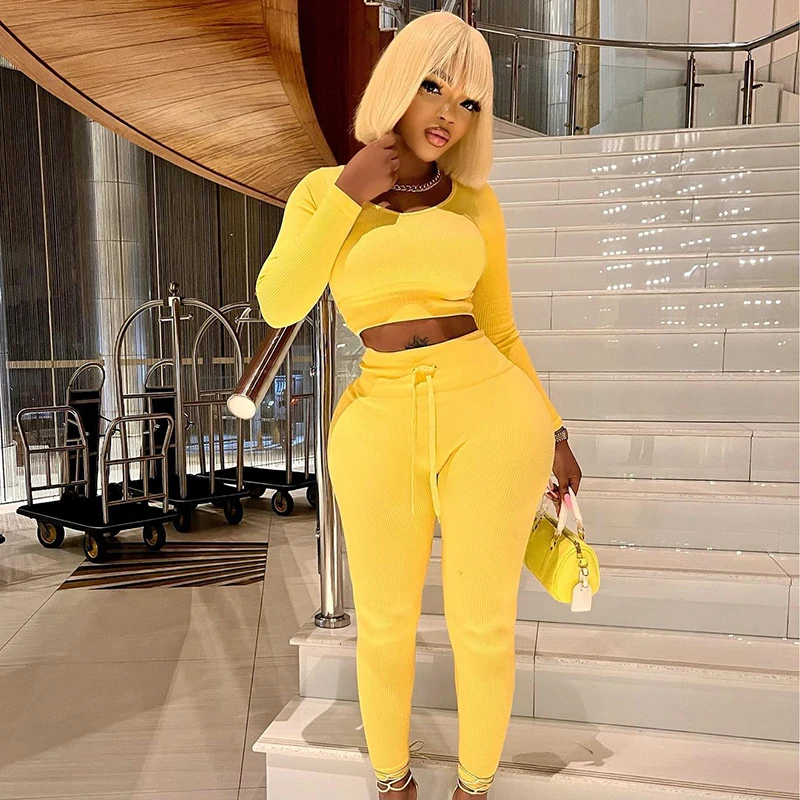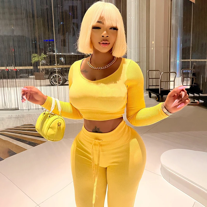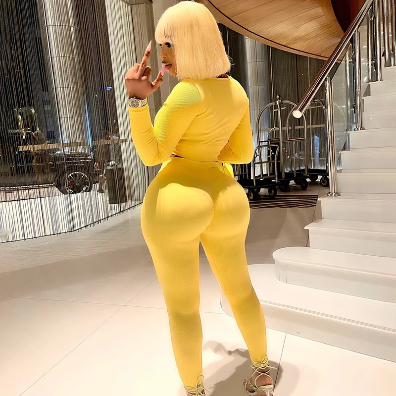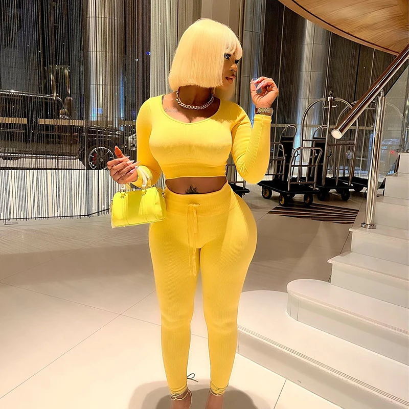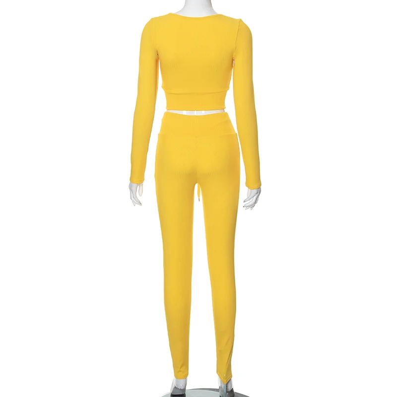 Yellow Long Sleeve Skinny Crop Tops + High Waist Leggings 2-Piece Set