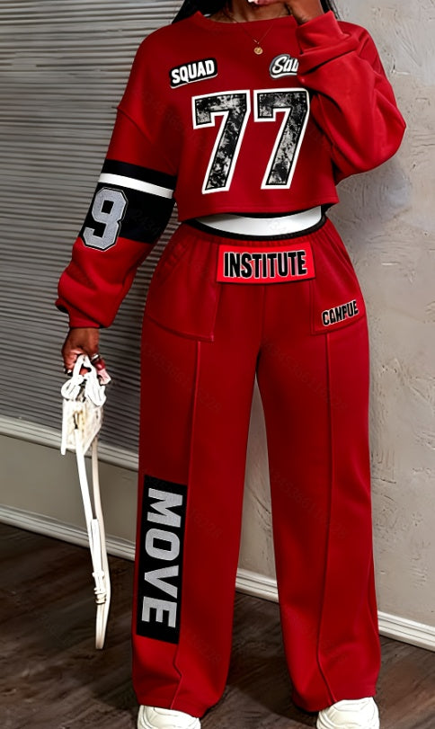 Streetwear Letter Print Women's Long Sleeve Cropped O-Neck Sweatshirt + Drawstring Pleated Sweatpants 2-Piece Set to 3X Plus Size
