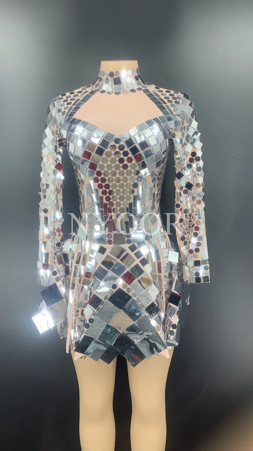 Sparkling Mirror Geometric Metallic Sequin Long Sleeve Formal Party Stage Performance Dress