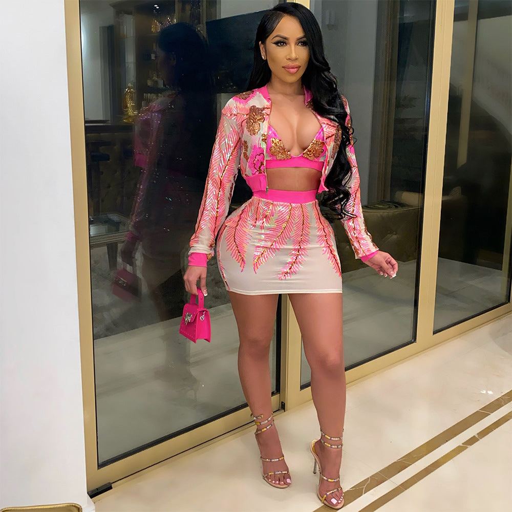 Tropical Print Women's Sequin Zipper Bomber Jacket + Bra + Mini Skirt Matching 3-Piece Set