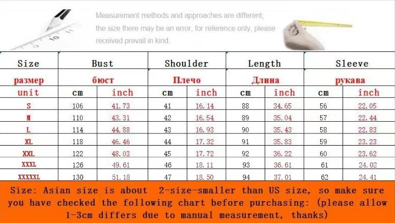 Note: 1. Asian sizes are 1 to 2 sizes smaller than European and American people. Choose the larger size if your size between two sizes. Please allow 2-3cm differences due to manual measurement. 2. Please check the size chart carefully before you buy the item, if you don't know how to choose size, please contact our customer service. 3.As you know, the different computers display colors differently, the color of the actual item may vary slightly from the following images.