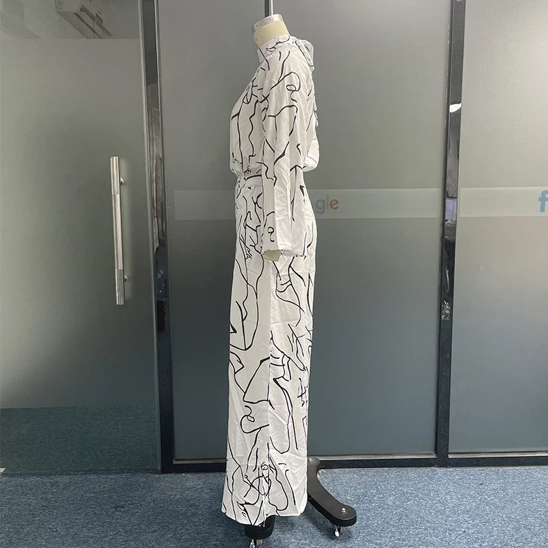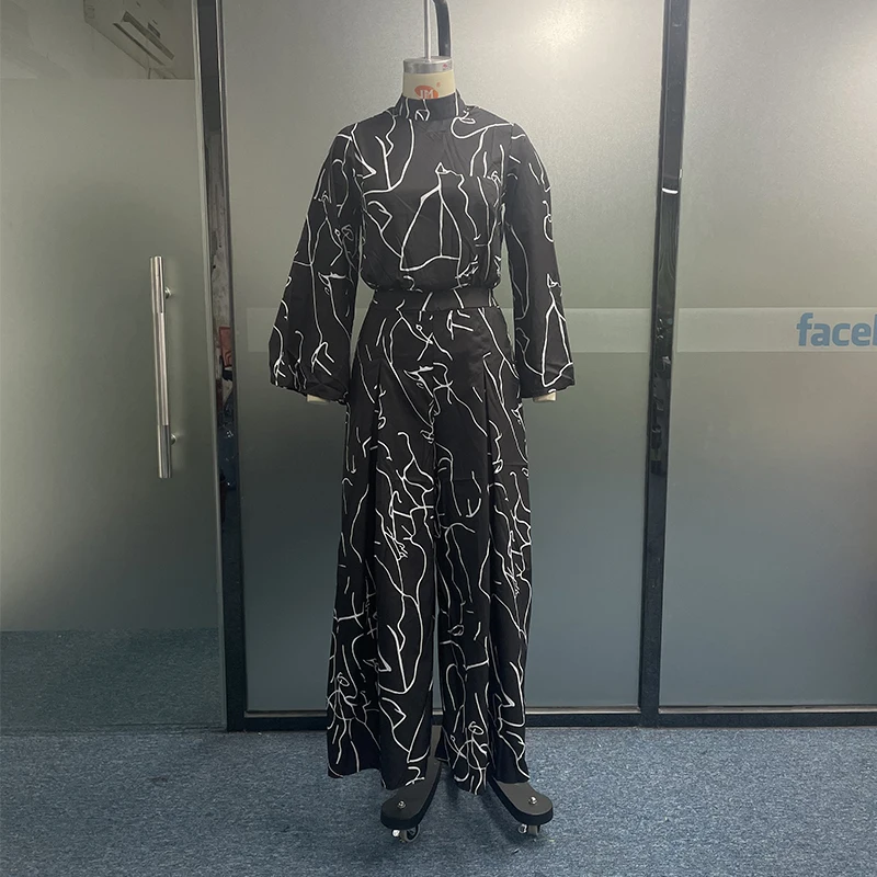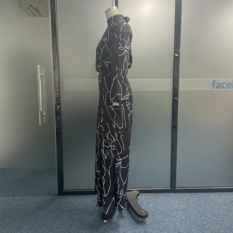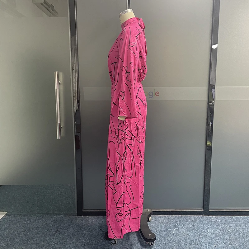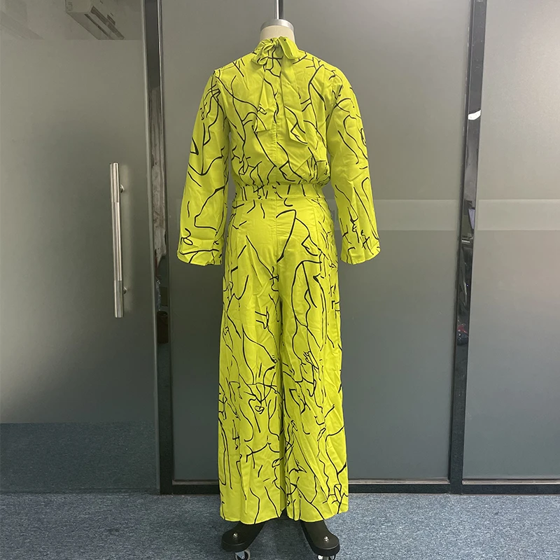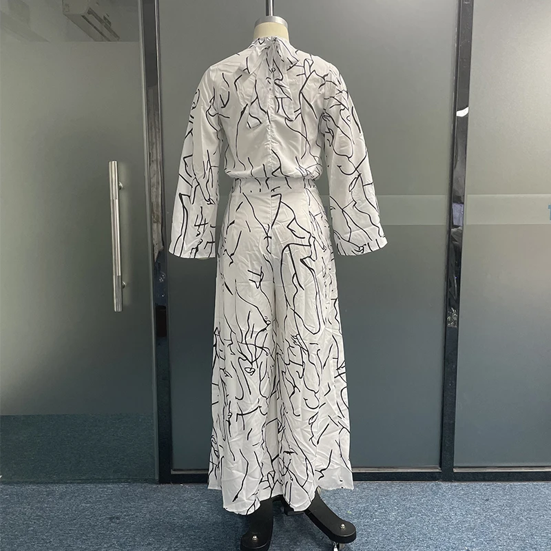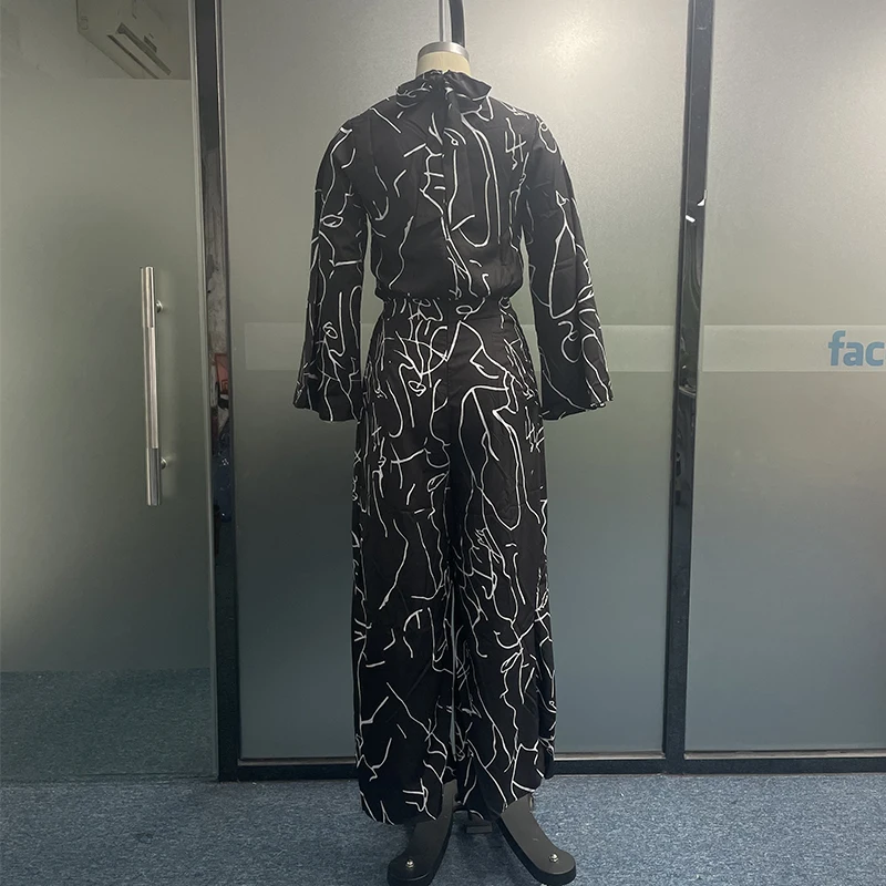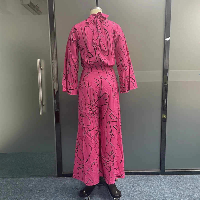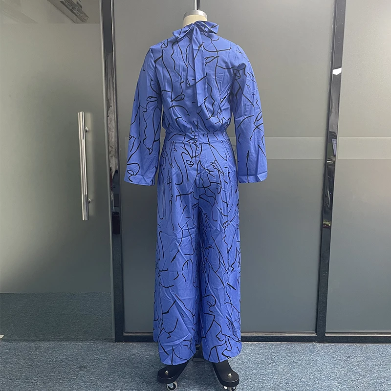 Abstract Long Sleeve Tie Nipped Waist Wide Leg Jumpsuit