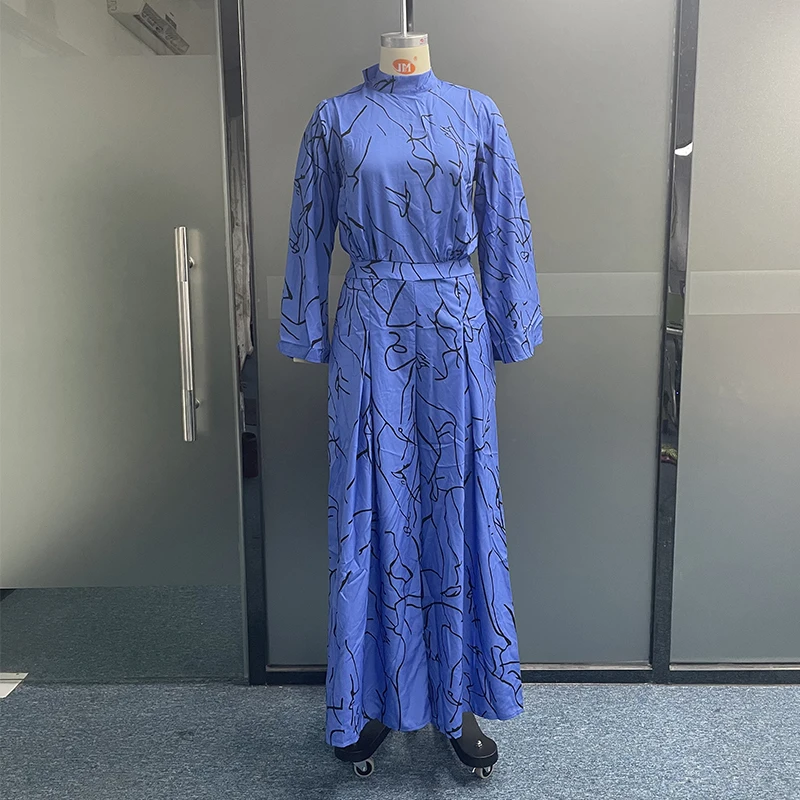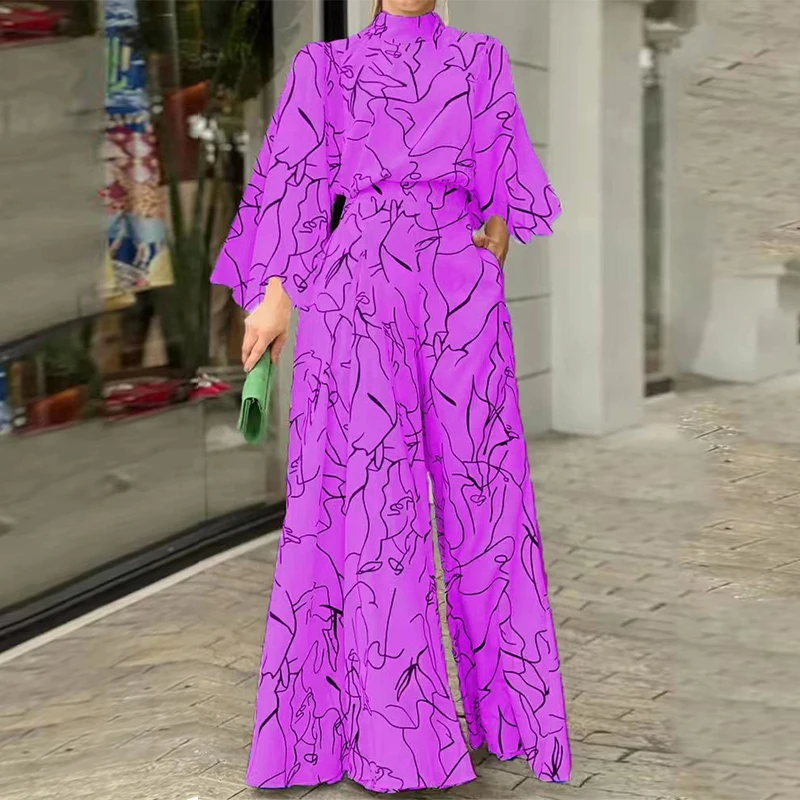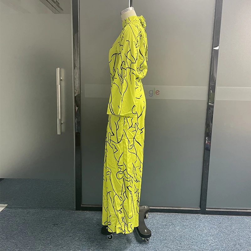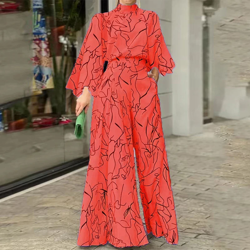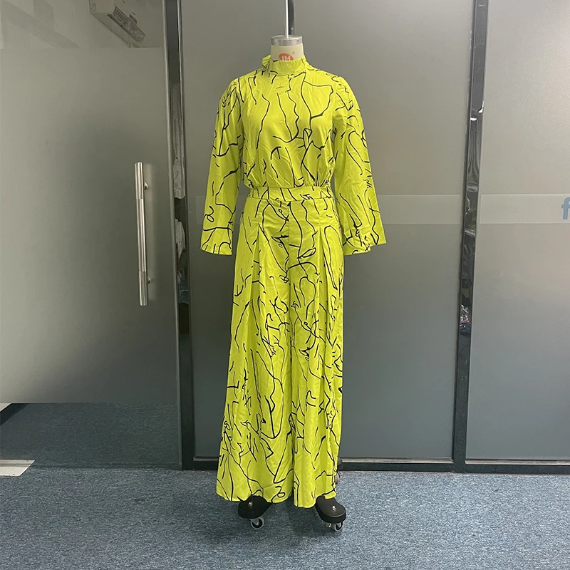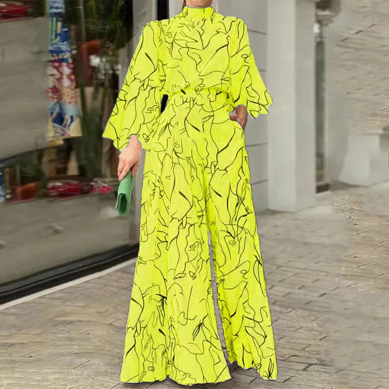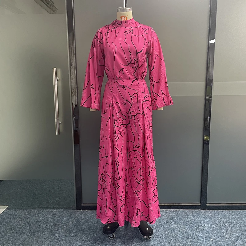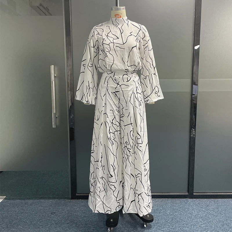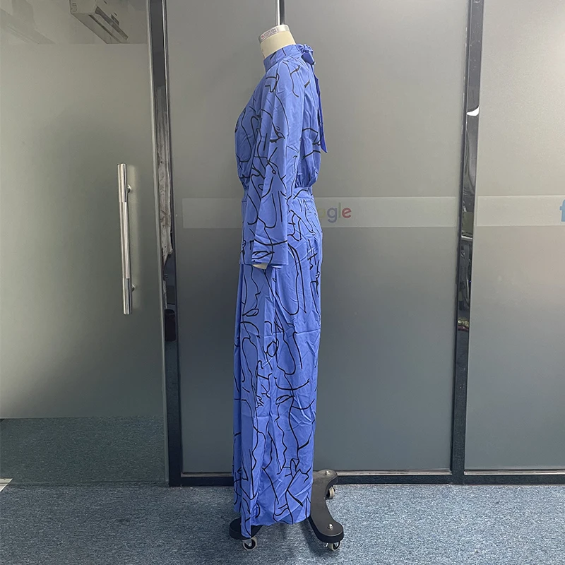 Abstract Long Sleeve Tie Nipped Waist Wide Leg Jumpsuit