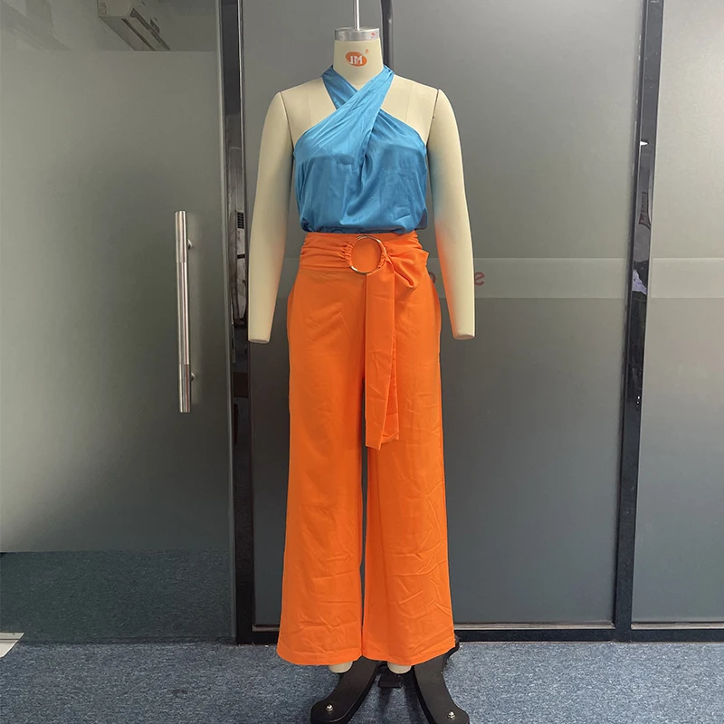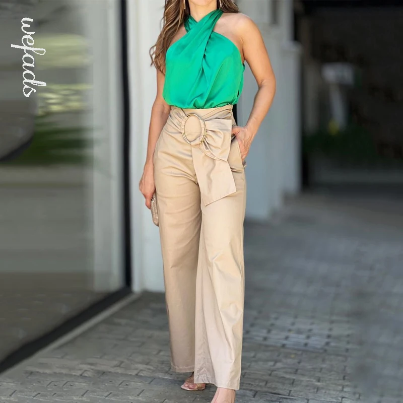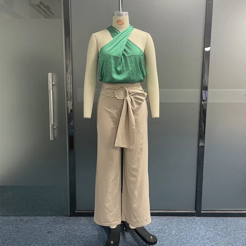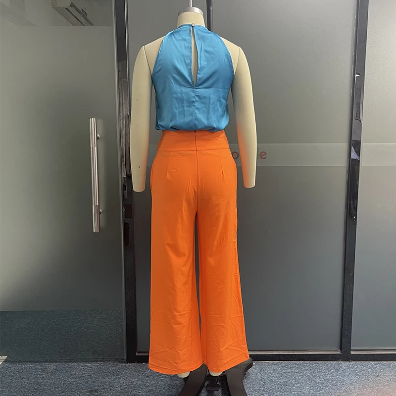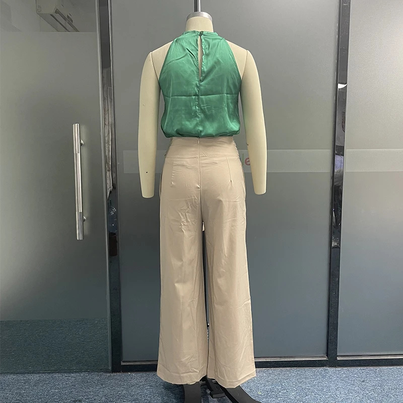 Halterneck Sleeveless Satin Top + Loose Wide Leg Long Pants 2-Piece Set