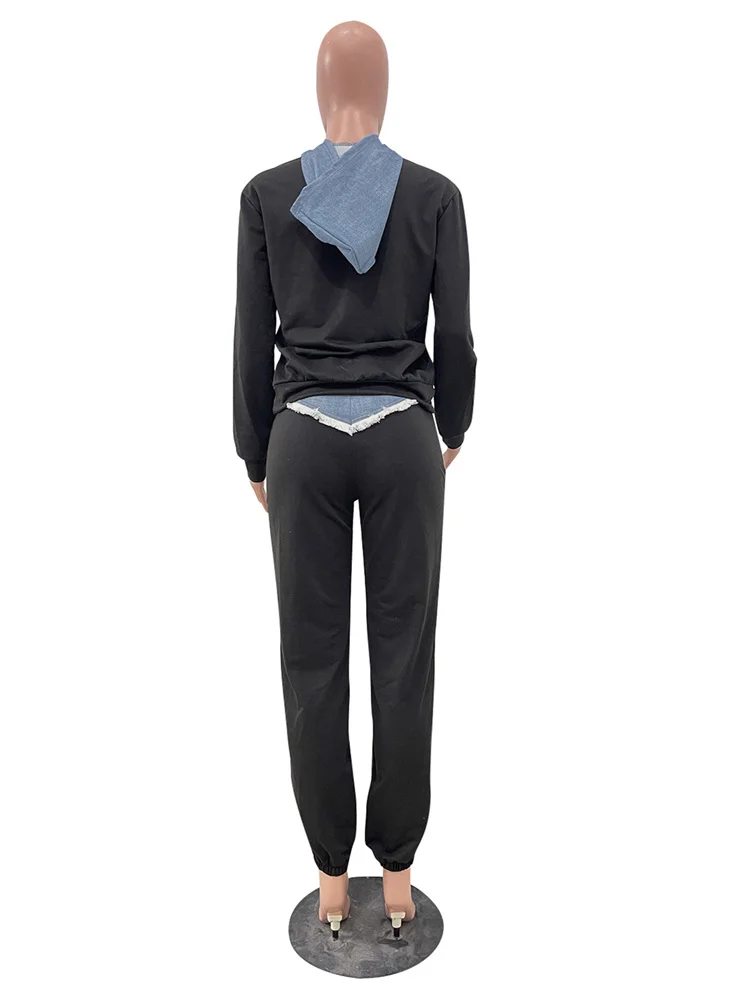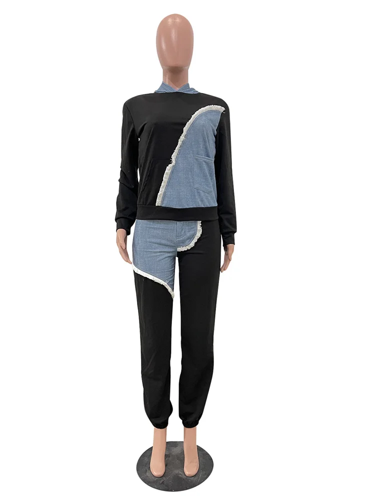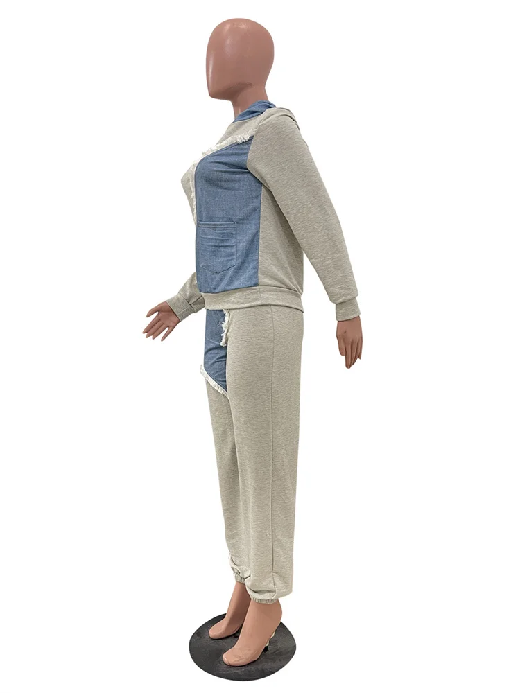 Patchwork Demin Decor Hoodie & Sweatpant Matching 2-Piece Set Plus to 4X