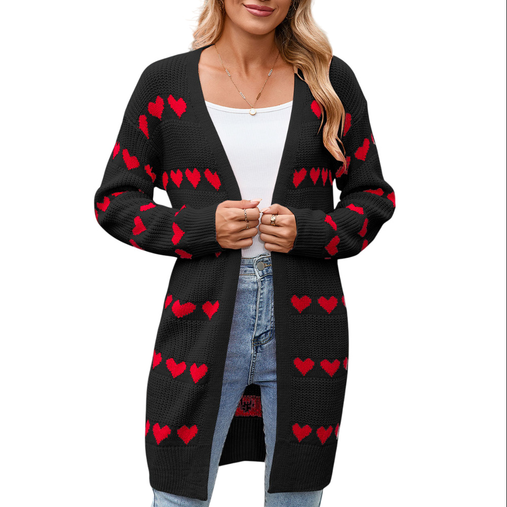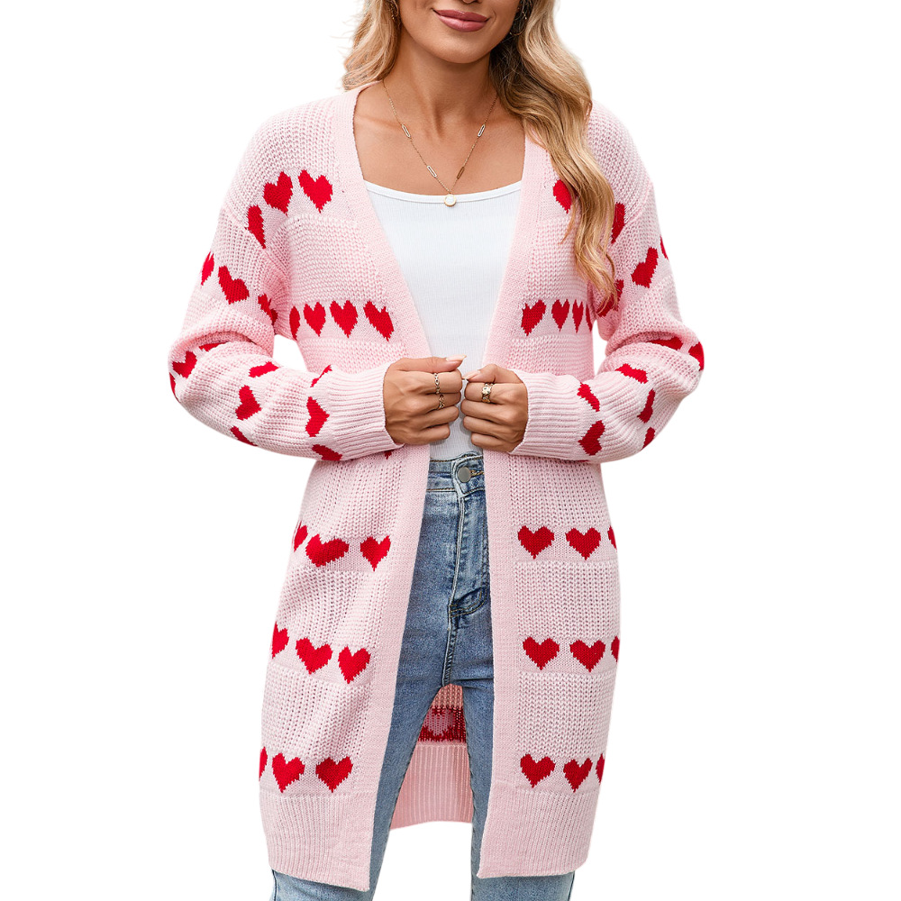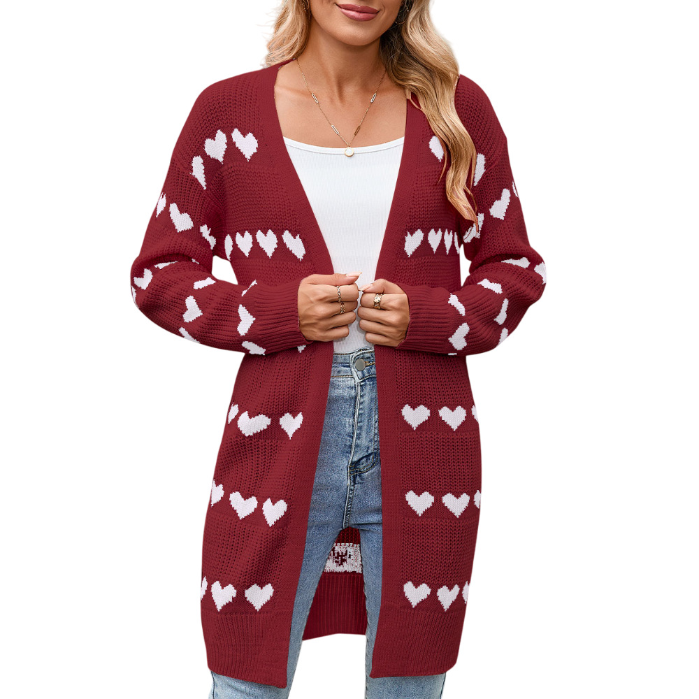 Women's Heart Print Long Sleeve Jacquard Cardigan Maxi Sweater